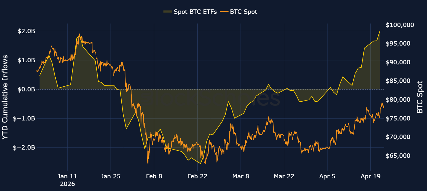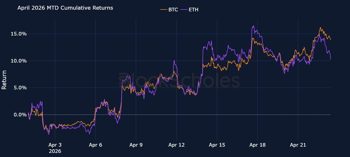 Through April, BTC and ETH have both rallied to a peak of ~16% month-to-date. After President Trump’s indefinite extension of the US-Iran ceasefire, BTC rose to $79,500 — a price it last traded hands at on Jan 31, 2026, nearly three months ago.