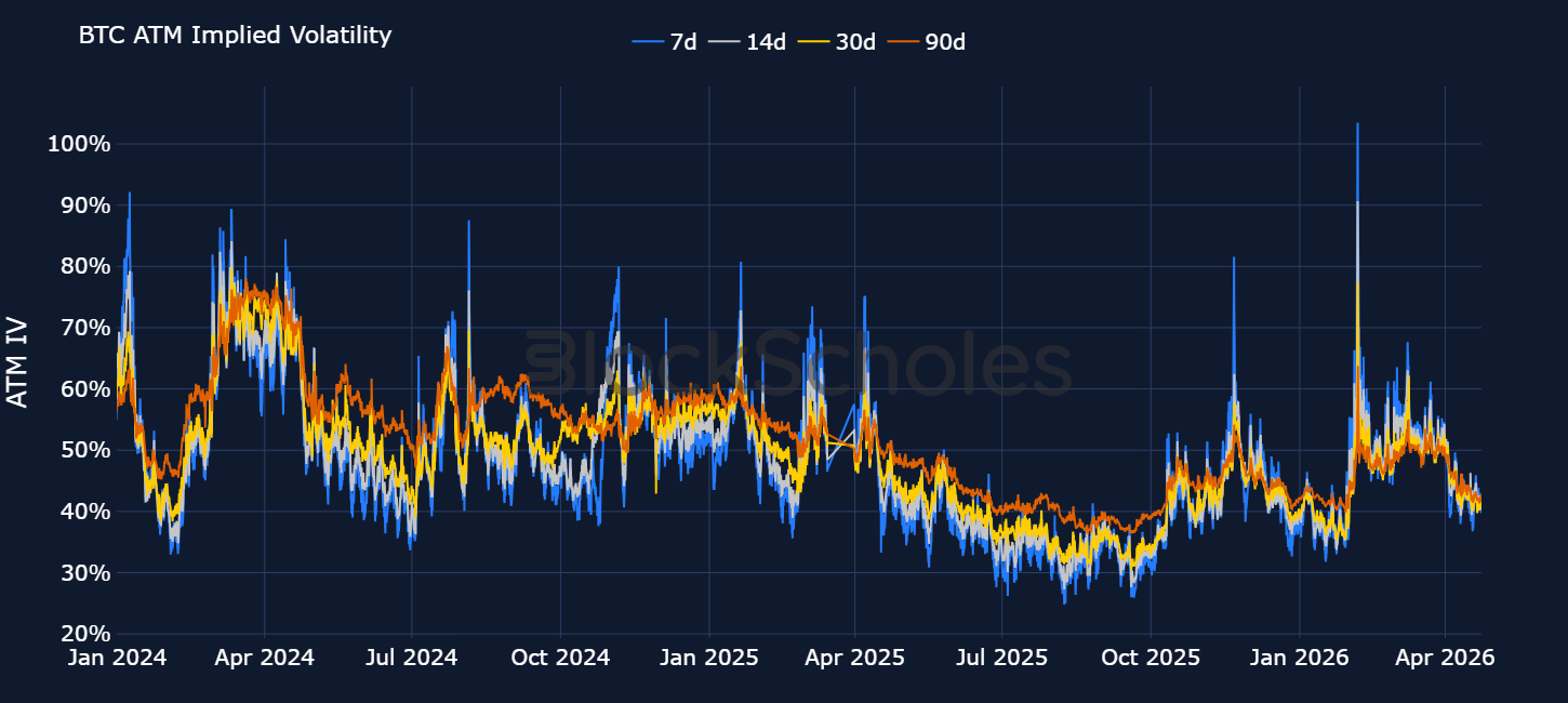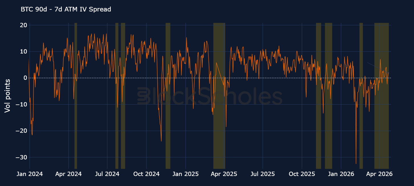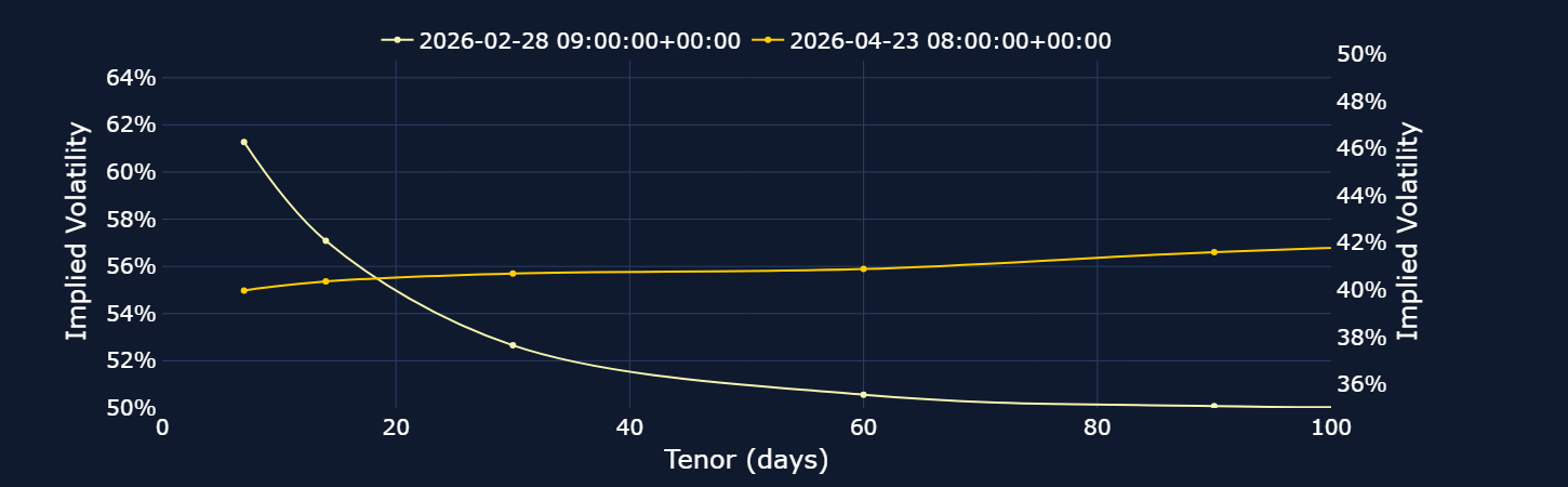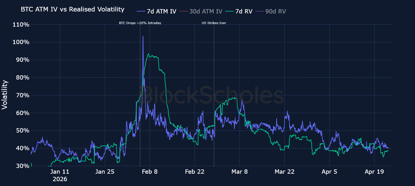 Through April, BTC and ETH have both rallied to a peak of ~16% month-to-date. After President Trump’s indefinite extension of the US-Iran ceasefire, BTC rose to $79,500 — a price it last traded hands at on Jan 31, 2026, nearly three months ago. Crypto’s primary measure of risk premium — implied volatility — reacted significantly to President Trump’s late February address to the world that the US had launched "major combat operations" against Iran. Short-dated volatility immediately jumped 10 percentage points to 60% and later to 70%. While that was a small reaction relative to the Feb 5, 2026 selloff when BTC experienced its largest single-day drop since the collapse of the FTX exchange, 7-day vol trading between 60-70% marked a dramatic step up from the past 12 months of sub-40% volatility.
