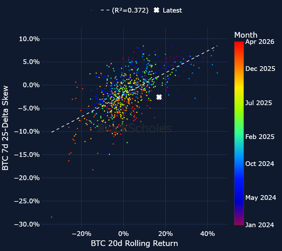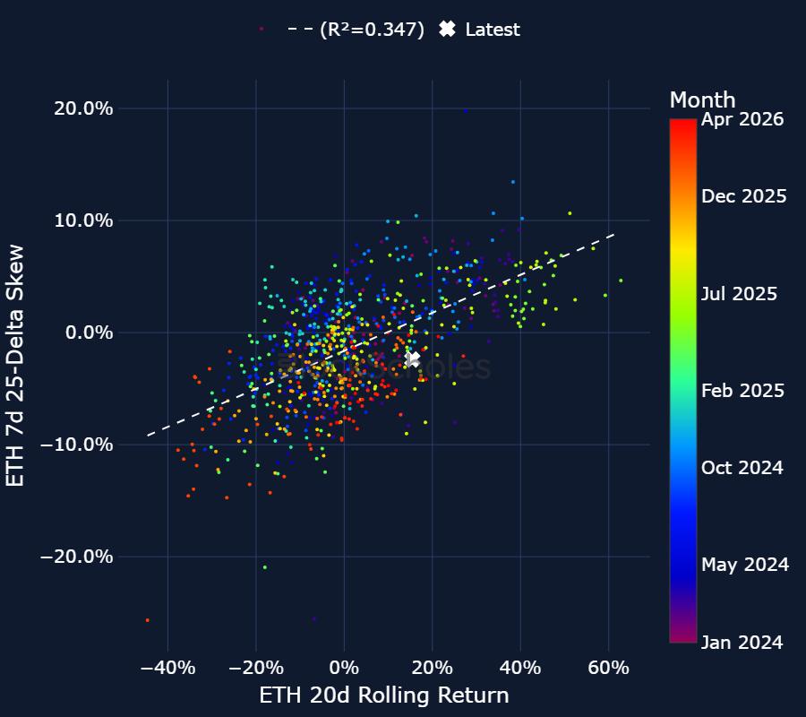 A linear regression between rolling 20-day BTC returns and 7-day 25-delta skew reveals just how skeptical options markets are of the current rally. With BTC currently up 16% over the past 20-days, the historical relationship between rolling returns and skew would imply a positive skew of 2%. Instead, out-the-money puts trade with a 2.57 vol point premium over calls. The same skepticism can be seen in ETH options too — historically, a spot price rally of 15% in the last 20 days has seen a call-skew above 1%. Instead, the 25-delta skew trades at -2.4%.