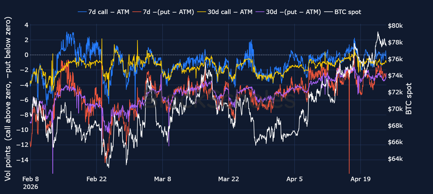 With volatility drifting lower and spot price marching higher, 25-delta risk reversals for BTC and ETH have mostly recovered from their deeply negative put premium. For the first time in two months, on April 17, 2026, 7-day risk-reversals temporarily tilted towards calls.