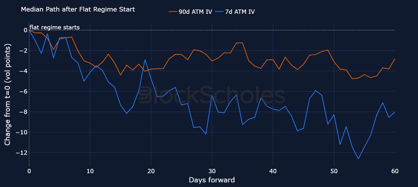 The median path suggests the curve re-steepens primarily through the front end falling, rather than a rise in the back end. Over the 60 days following a flat-regime start, 7d ATM IV drops by a median of −8 vol points, while 90d ATM IV drifts down only −3 vol points, causing the curve to normalise.