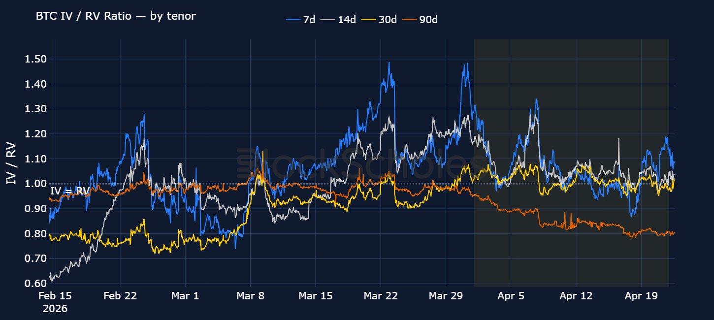 7-day BTC implied vol and realised vol rose to 61% and 68% at the onset of the war. Those values are now 43% and 41% respectively — both below pre-war levels. Part of the decline in implied volatility can be attributed to the fall in delivered volatility over the same period of time, however, the ratio of BTC IV to RV reveals that the former has been dropping at a much faster rate than realised vol.