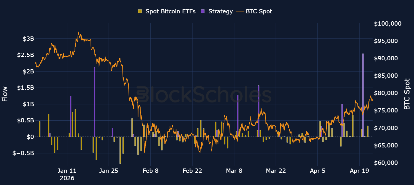 Despite their skepticism, there are a number of catalysts that may suggest derivatives markets could be underpricing the probability of a continued rally, beyond just an end to the US-Iran conflict. Strategy recently announced a purchase of $2.5B worth of bitcoin on April 20 — the digital asset treasury’s largest purchase since November 2024.