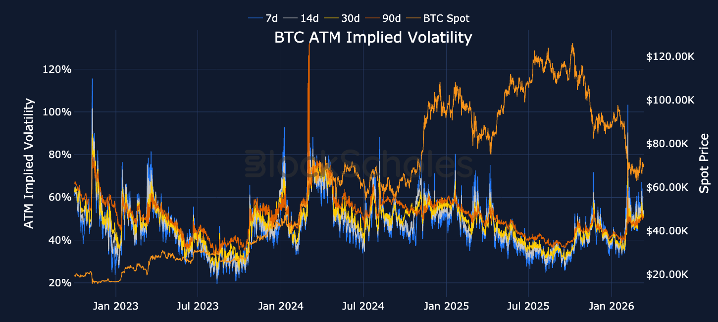 In February this year, the volatility implied by BTC options rose to the highest level since the collapse of the FTX exchange in 2022, exceeding 100% for 7-day options contracts. After reaching that high, the demand for optionality dropped significantly, with ATM implied volatility finding a floor closer to 50% across the term structure (to access implied volatility surface data by delta see here). Volatility expectations were then reignited in the tail-end of February after the US announced military airstrikes against Iran, with 7-day volatility jumping 20 percentage points to 70%.