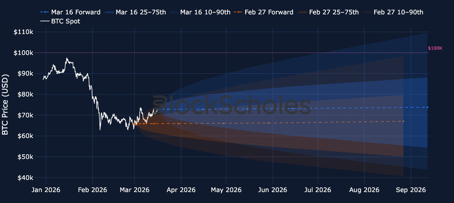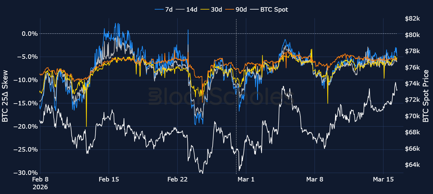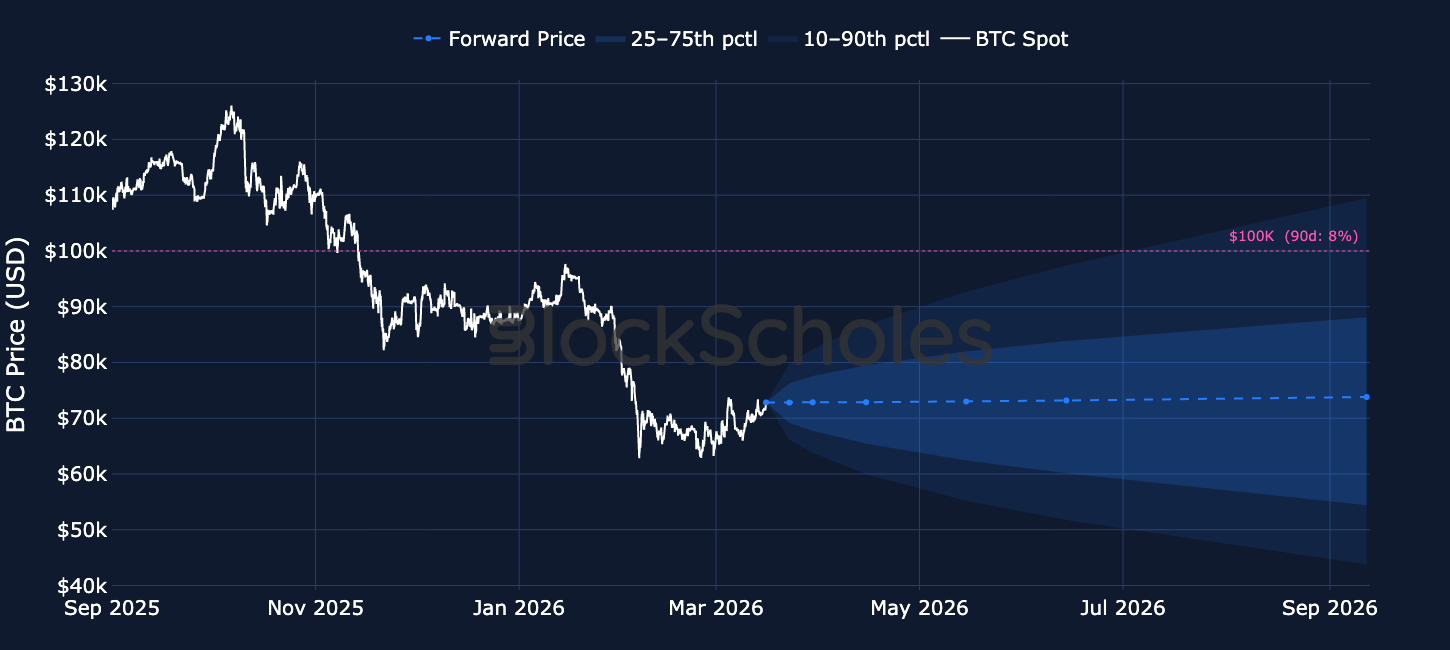 With BTC’s spot price now trading around $73K, what are options markets pricing-in for over the upcoming months. Has that changed since the onset of the US’s war in Iran?