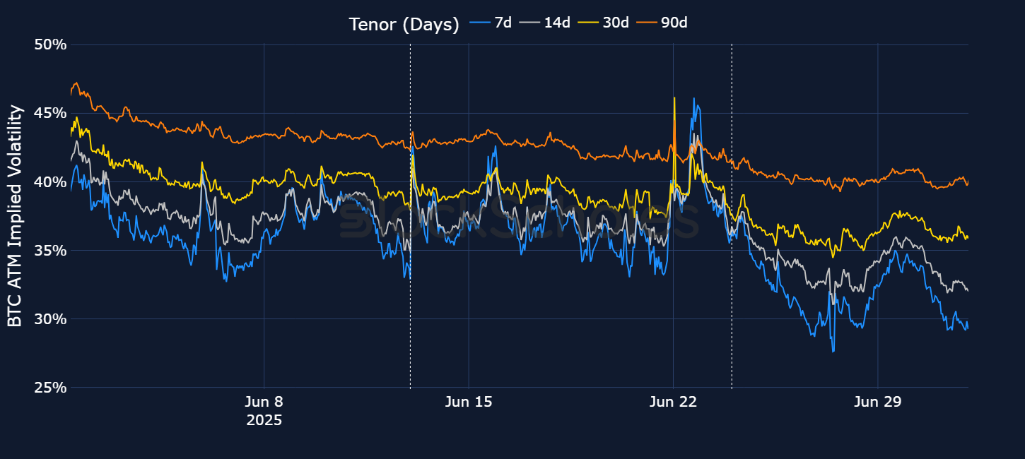 BTC options traders also mostly looked through tensions during the Twelve-Day war. Implied volatility jumped around 10 points to 46% when the US struck Iranian nuclear sites, though that is far below the implied volatility priced in by options markets in historic periods of crisis.