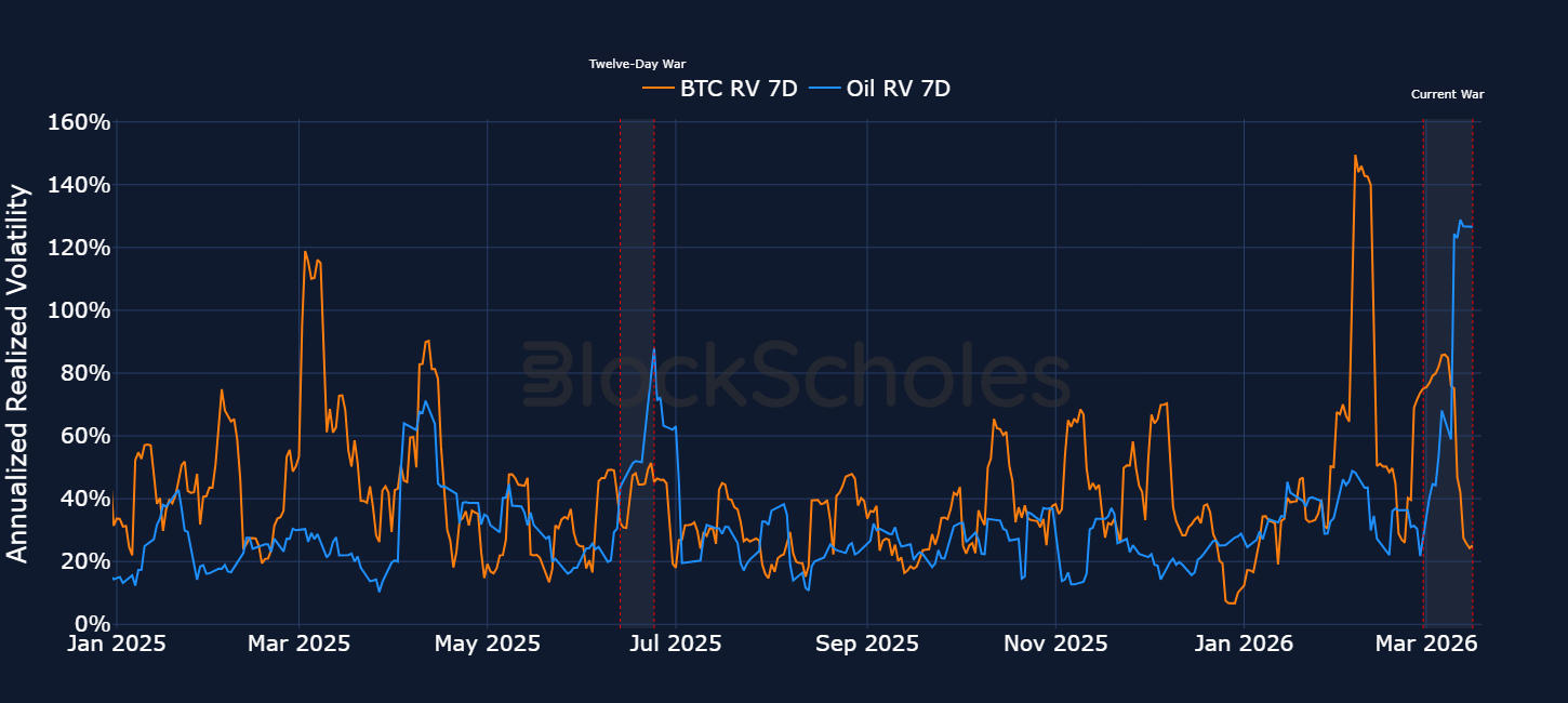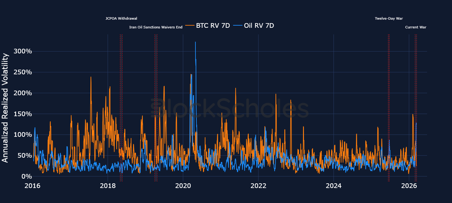 The multi-year highs in delivered and implied volatility in oil contrasts the more mellow response in BTC. However, looking back at previous escalations between the US and Iran, BTC’s lack of a reaction function to the current war is to be somewhat expected. During the Twelve-Day war, delivered volatility (calculated on daily closing price) rose by around 20 percentage points from the start of the conflict to 50%. That was far below the volatility delivered by spot price earlier in the year during other geopolitical tensions, for example during the tariff escalation between the US and China in February 2025, or the Liberation Day tariffs of April 2025.