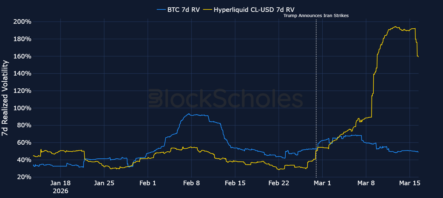 We can zoom in on this particular period using more granular data also. Below we again plot 7-day realised volatility, but this time on hourly data (from Block Scholes’ composite spot data aggregated from different exchanges) and hourly prices on CL-USDC — a perpetual futures contract that tracks the value of 1 barrel of West Texas Intermediate (WTI) Light Sweet Crude Oil, deployed by the XYZ protocol on Hyperliquid.