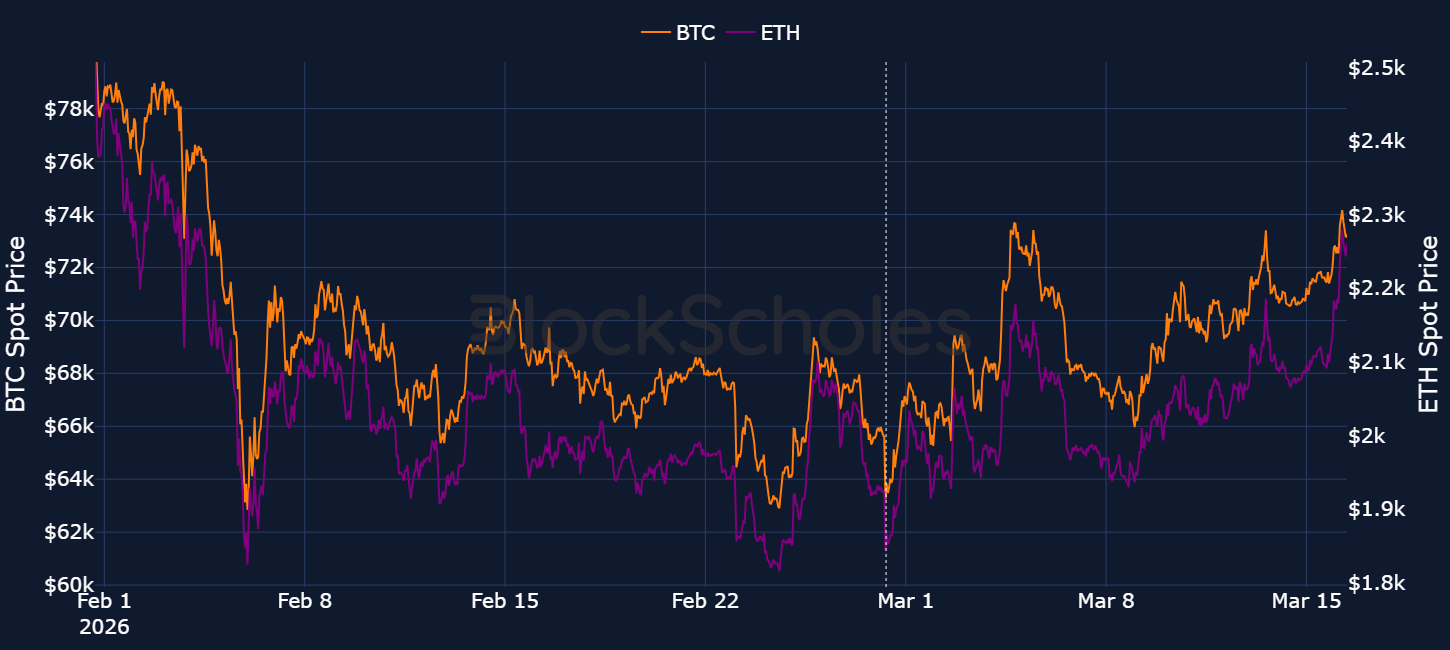 Despite still being down more than 40% from its all-time high, BTC has shown significant strength in the face of the geopolitical shock. Since the first weekend airstrikes, spot price has slowly moved higher from $63K to $73K. We’ve also shown that the premium in short-dated BTC options, or how much traders are willing to pay for optionality, has been easing over the same period of time.