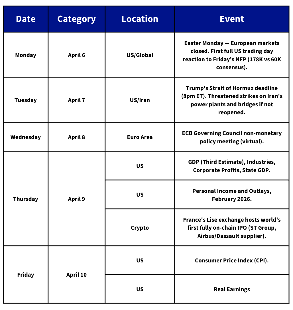 Trump's Tuesday 8PM deadline for Iran to reopen the Strait of Hormuz looms as the week's defining catalyst, with Tehran rejecting ceasefire proposals and Trump warning that "the entire country can be taken out in one night." US equities opened cautiously higher (S&P +0.3%, Nasdaq +0.4%) while gold pulled back to ~$4,700. BTC bounced 4.3% to ~$70K late Sunday after spending much of the weekend at ~$66K, with ETH climbing to ~$2,150 alongside a broader altcoin rally — though SOL remains under pressure at ~$82 as Drift Protocol's $285M exploit, now attributed to DPRK-linked actors, continues to weigh on Solana sentiment.