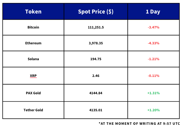 - That sell off has seen BTC once more test the $111K level, falling from $115K, while ETH now trades below $4,000, falling from $4,200 late yesterday night.