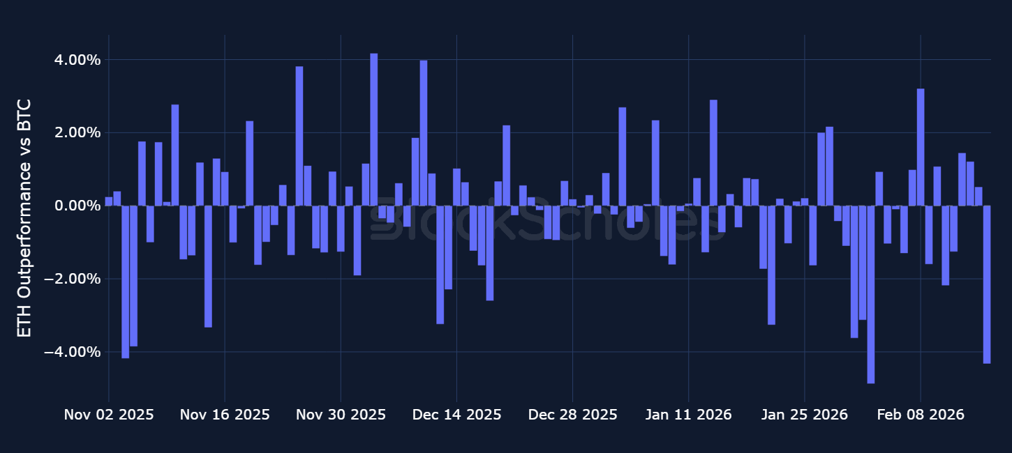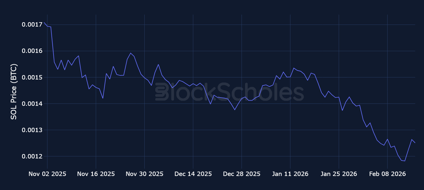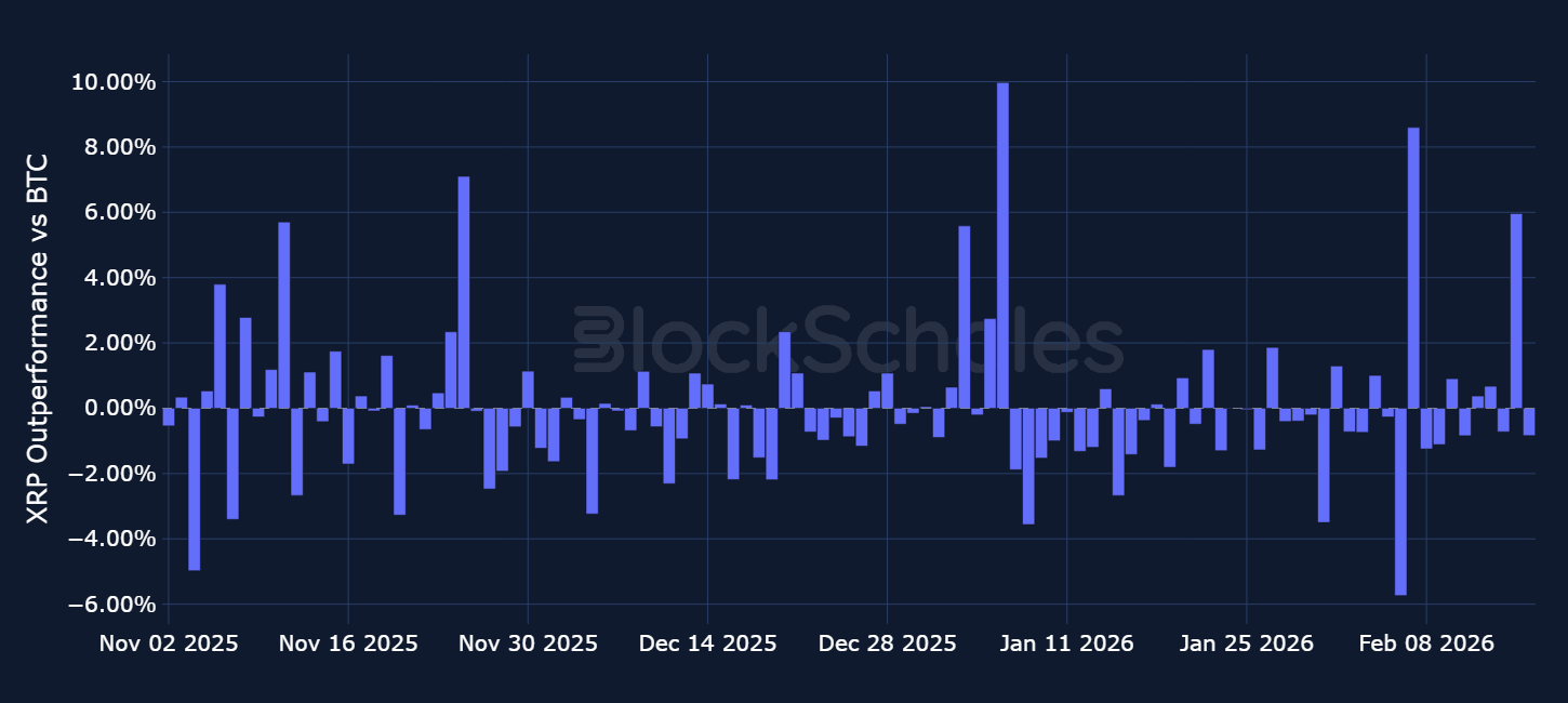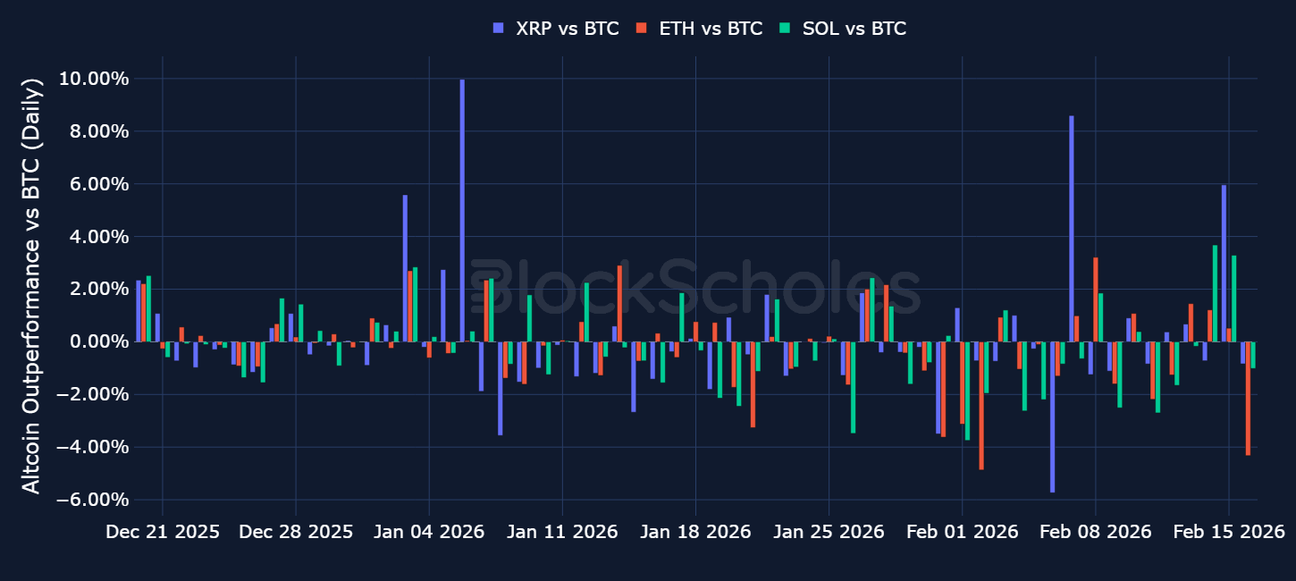 Altcoins Outperformance – ETH underperformed BTC by 5% on Feb. 16. In comparison, XRP and SOL both outperformed: SOL rose 3.6% and 3.2% relative to BTC on consecutive days following earlier-week underperformance, while XRP saw a one-day 5.9% outperformance relative to BTC and otherwise moved more in line with BTC returns for the rest of the week.