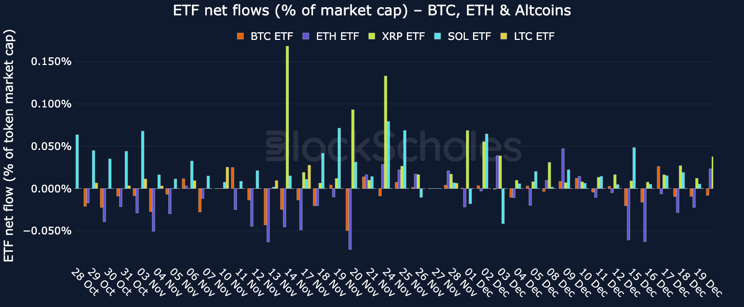 ETF Flows – Since 10 Dec, BTC and ETH ETFs saw net outflows overall. ETH outflows were concentrated mid-week, while BTC flows were smaller. Altcoin ETFs held up better: inflows were led by SOL, largest single-day inflow, and XRP, with XRP/LTC among the strongest on a market-cap-normalised basis into 22 Dec.