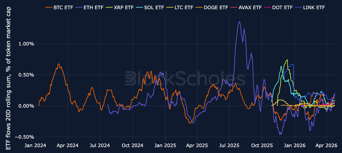 Altcoin ETF flows were more modest, but still broadly positive.