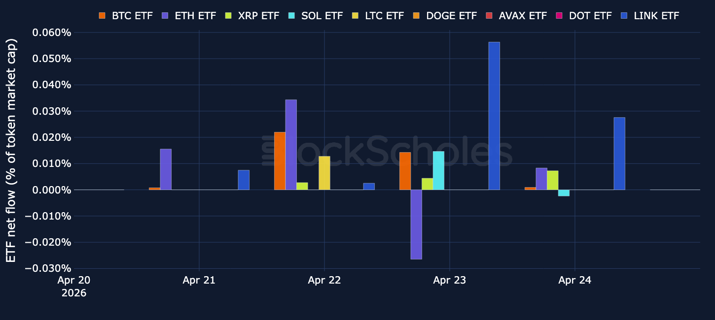 XRP ETFs recorded $15.75M in net inflows, led by a $6.44M intake on Friday, while SOL ETFs attracted $9.44M, with $7.33M of that arriving on Thursday. LINK ETFs added $6.37M in net inflows, and LTC ETFs saw a smaller $0.55M inflow over the week.