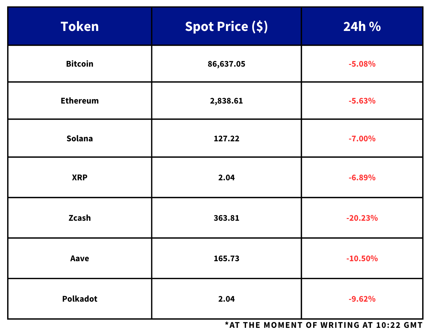 - In early Asian trading hours today, BTC fell to a low of $85K and is down 5% over the past 24 hours. That occurred alongside a 6% drop in Ether’s spot price which fell to $2,800, while other majors including XRP and SOL are down close to 7%.