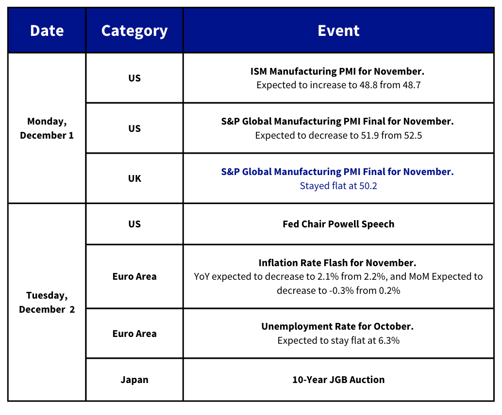 - Bank of Japan Governor Kazuo Ueda made his clearest indication that the central bank may consider hiking interest rates in their December meeting — in a speech earlier today he said the bank “will consider the pros and cons of raising the policy interest rate and make decisions as appropriate.”