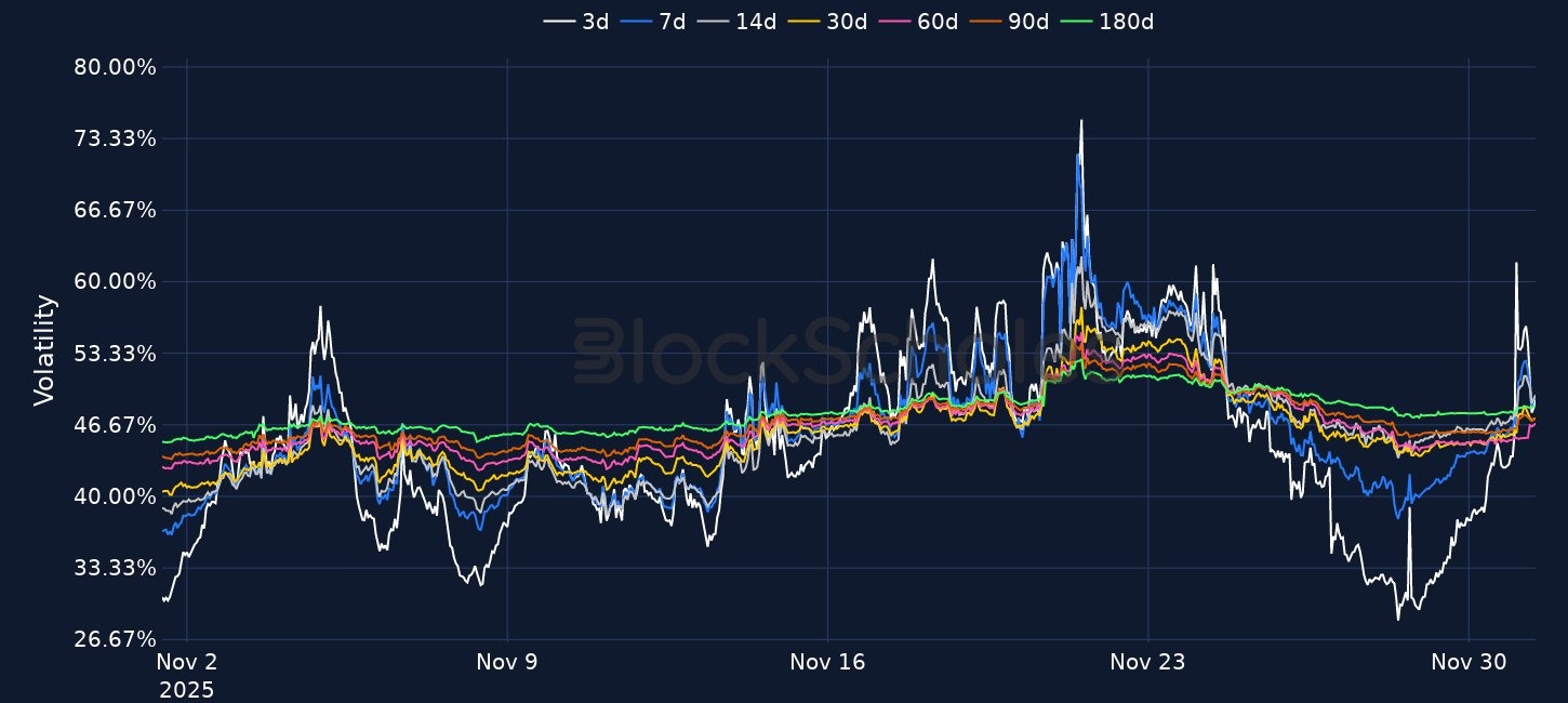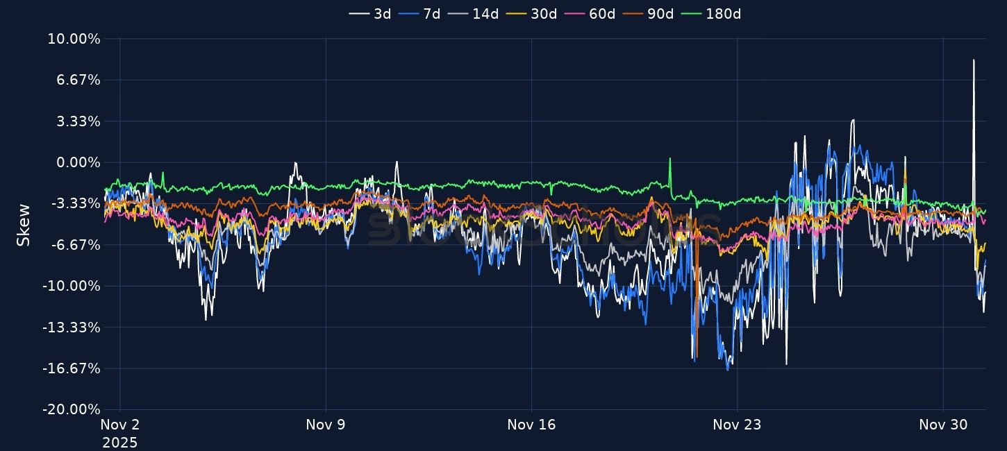 BTC dropped 5% to $85K in early Asia with ETH -6% to $2,800 and majors like XRP/SOL -7%, reversing last week’s thin-liquidity recovery above $90K after the $19B leverage unwind of 10 October. BTC 7D ATM vol has rebounded 5 vol points to 49% (c.10 vols higher over the weekend) with a flatter term structure and 25-delta skew now showing an 8 vol point premium for downside puts, while ETH ATM vols are compressed around 71% across tenors. Macro risk-off is underscored by JGBs, with the 2Y above 1% for the first time since 2008, 10Y at ~1.845%, and hike odds for the 19 Dec BoJ meeting priced at 76% (and ~90% for at least one hike by end-Jan). Crypto-specific headwinds include potential BTC sales from Strategy Inc. if its 1.19x mNAV turns negative, ~$3.5B of US spot BTC ETF outflows in November, renewed PBOC enforcement language on “illegal” virtual currency activity, and shifting ETF/infra developments (CoinShares product cancellations, a potential US Chainlink ETF, Sony’s USD stablecoin plans, and Ethereum’s Fusaka upgrade on 3 Dec).