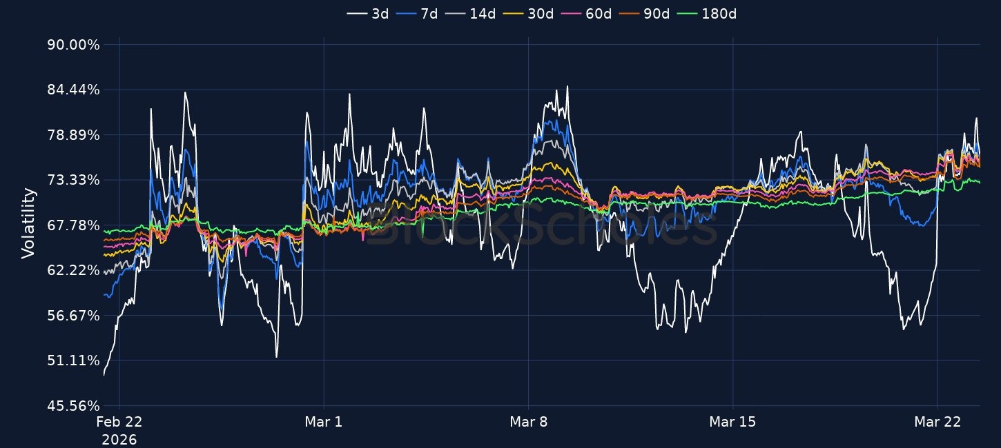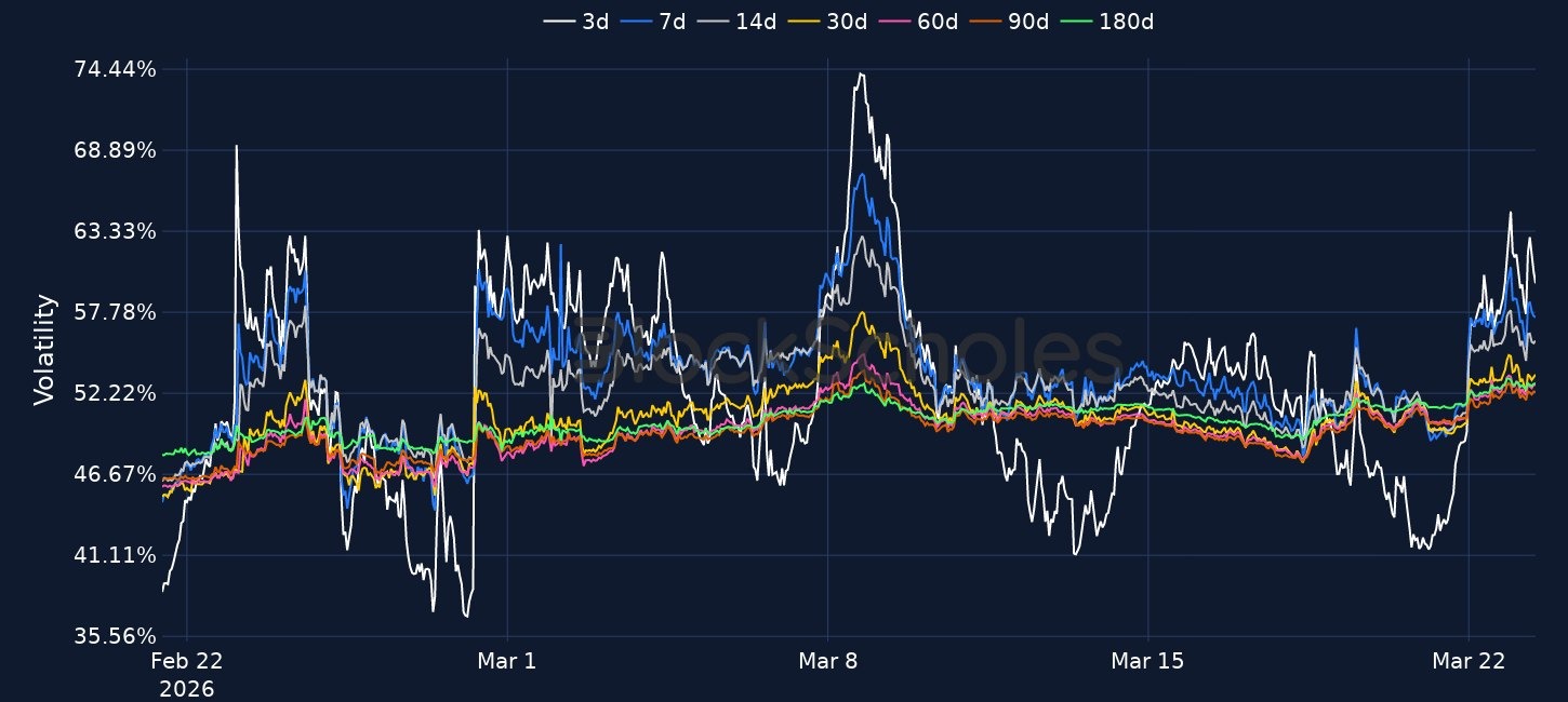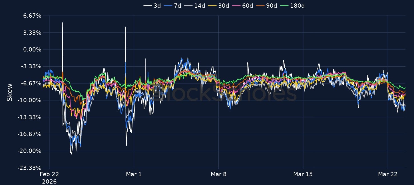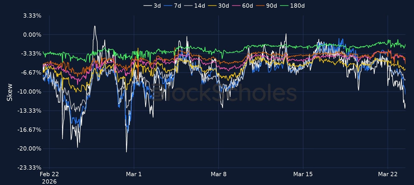BTC traded down to $68K before rebounding above $71K, with the move accompanied by a sharp repricing in options as 7-day BTC ATM implied volatility rose to 61% and short-dated skew fell to -12%. Macro sentiment also deteriorated, with Brent up 50% since the conflict began, major U.S. equity indices down 1–2% on Friday, and Treasury yields rising sharply over the past five days. In crypto market structure, Bitcoin difficulty fell 7.76% to 133.79T, Brazil paused crypto tax plans, U.S. exchanges completed the removal of ETF options position caps, Fidelity called for faster SEC rulemaking, and Grayscale filed for a HYPE ETF.