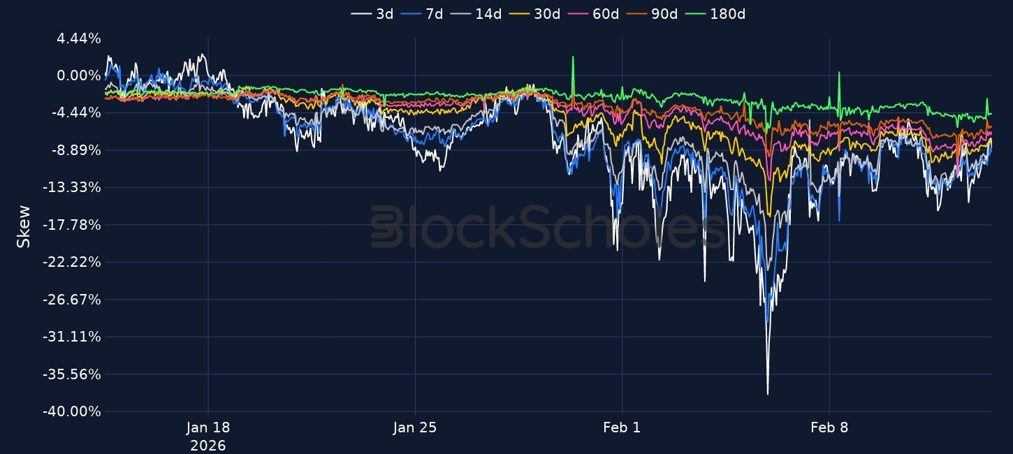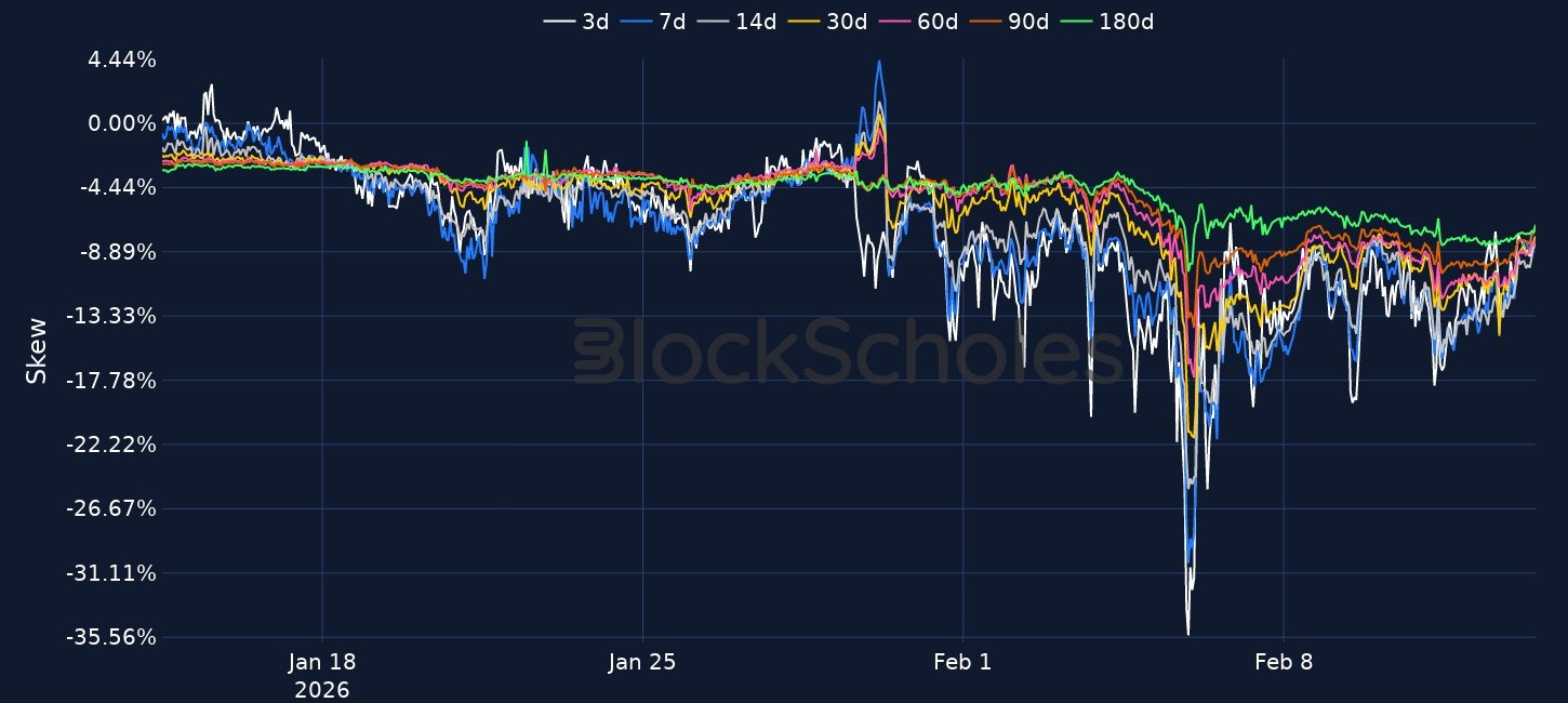 BTC remains rangebound at $65–68K after sliding from $70K this week, while options markets have rapidly de-risked with BTC and ETH implied vols around 50% and 65%, flat term structures, and persistent downside demand as puts trade 8–9 vol points over calls. Spot BTC ETFs saw $410.2M of outflows yesterday, taking the 20-day rolling total to -$3.8B, while ETH remains below $2,000 with ETH ETFs seeing $113.1M of outflows versus $2.7M of inflows into SOL ETFs. Risk sentiment remains pressured by the equity selloff, with the S&P 500 down 1.57% and the Nasdaq-100 down more than 2%, as macro attention turns to jobless claims at 227K following a stronger January NFP print of 130K ahead of today’s CPI.
