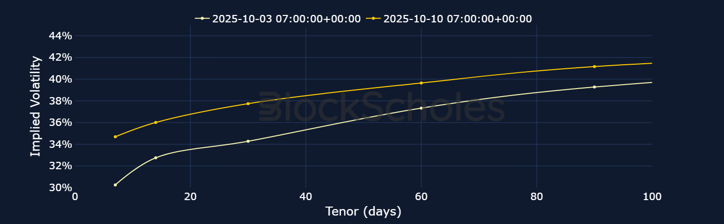 - Currently, it is difficult to find the upbeat ‘Uptober’ sentiment that derivatives markets entered the month of October with. Relative to one week ago, the entire term structure of implied volatility has lifted slightly higher, particularly for one-week contracts where IV has jumped 5 vol points.