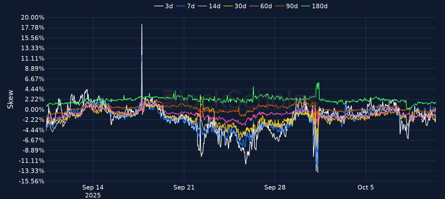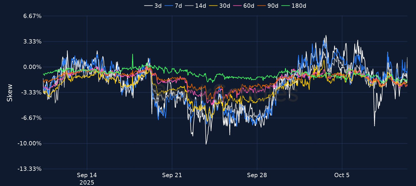 Bitcoin slipped from $123K to test $120K support and has since consolidated, mirroring a pause in broader risk-on sentiment. Spot Bitcoin ETFs added $197.8M, though Ethereum products saw $8.7M in outflows — their first since September 26. Across majors, Ether, XRP, and SOL are down 3–8% over the past week, while BNB rallied 15% on Binance Smart Chain memecoin flows. Derivatives show heightened downside hedging: one-week implied volatility is up 5 vol points and short-tenor skew has flipped from call demand to put premiums. Macro remains uncertain as Fed officials diverge on rate path, citing weaker labor data and persistent tariff effects. Meanwhile, industry headlines included Coinbase and Mastercard circling BVNK in a $1.5–2.5B deal, Sharps Technology adding $435M in SOL via Coinbase Prime, and Ripple partnering with Bahrain Fintech Bay.
