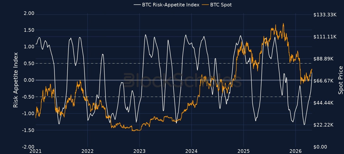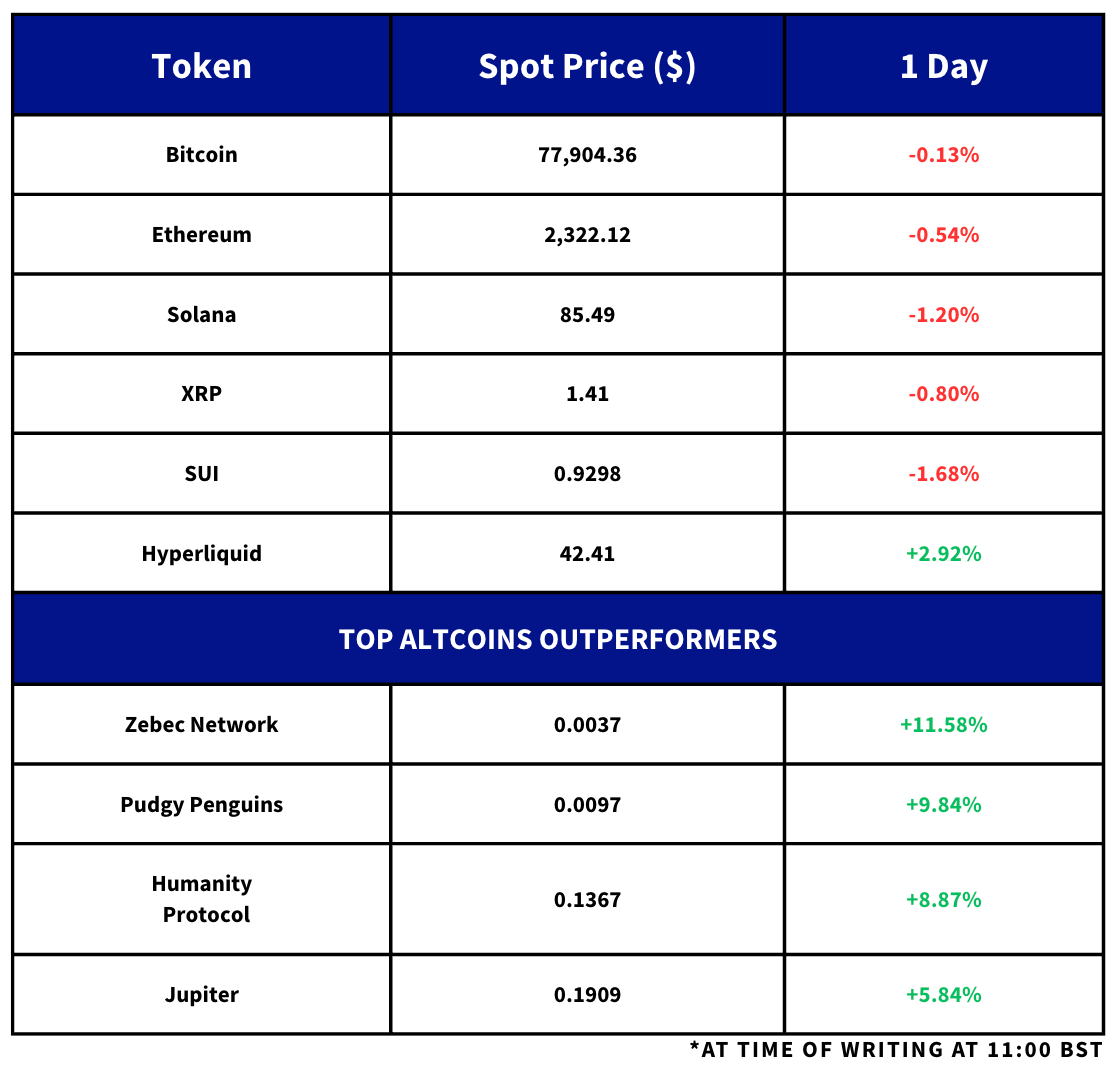 - Sentiment has since rebounded: in the early morning BTC rallied to a 12-week high above $79,400 before reaching a sharp wall of resistance and falling back towards $77,500.