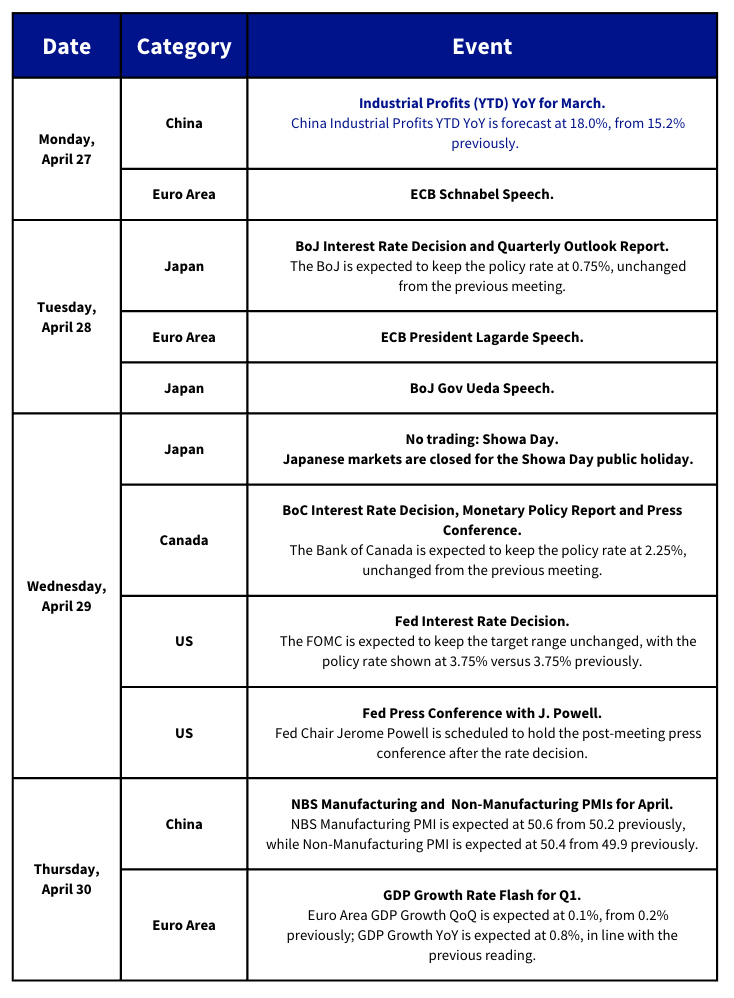 - Two-year yields fell from 3.84% down to 3.77% — so far in April the two-year yield has fluctuated within a 16bps range, the tightest since December 2020 according to Bloomberg.