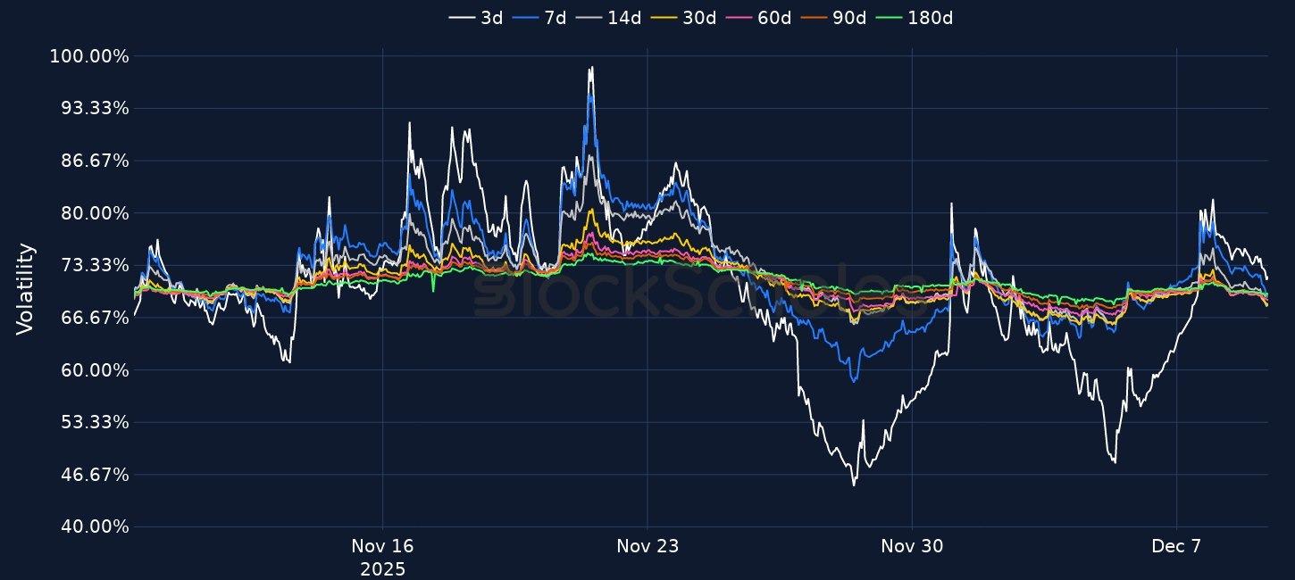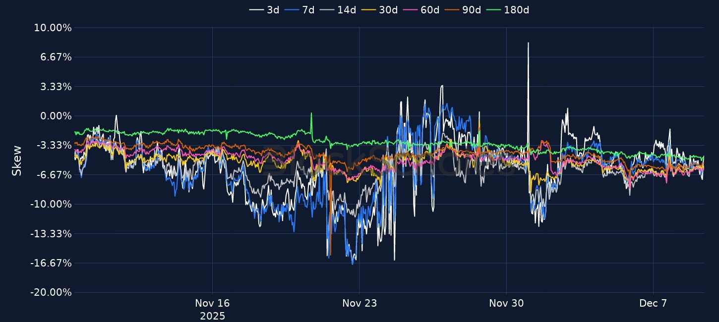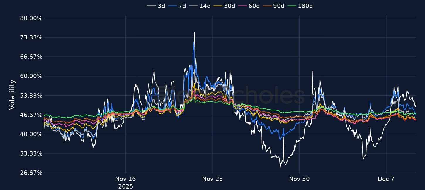 - BTC’s 7D ATM vol trades near 45%, same as the 180D options. Similarly, ETH’s short-dated IV is about 50%, compared with roughly 47% for longer tenors.