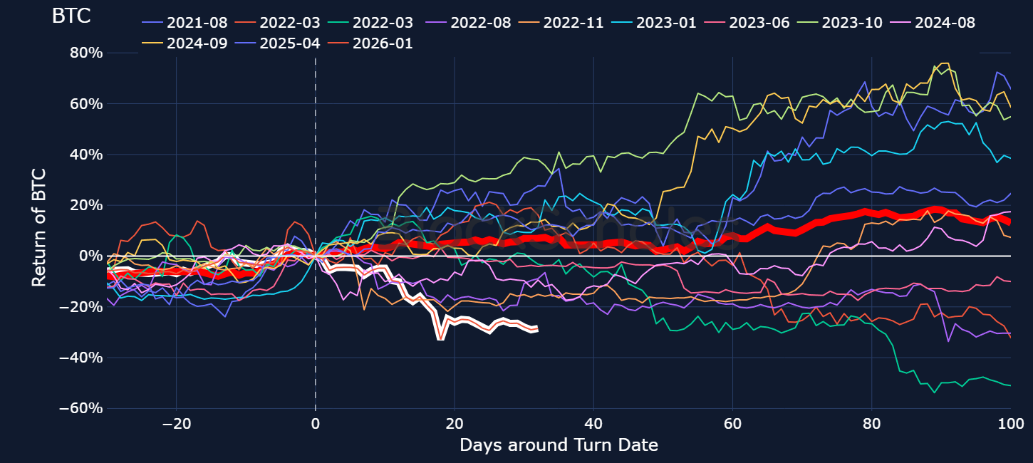 BLOCK SCHOLES BTC RISK APPETITE INDEX – Despite spot price now consolidating below $70K, risk-appetite continues to fall; slowly approaching the December 2025 bottom. The sideways spot price is most clear in the returns chart below where BTC returns has lingered around the -30% mark since crossing the -0.5 risk-appetite threshold.