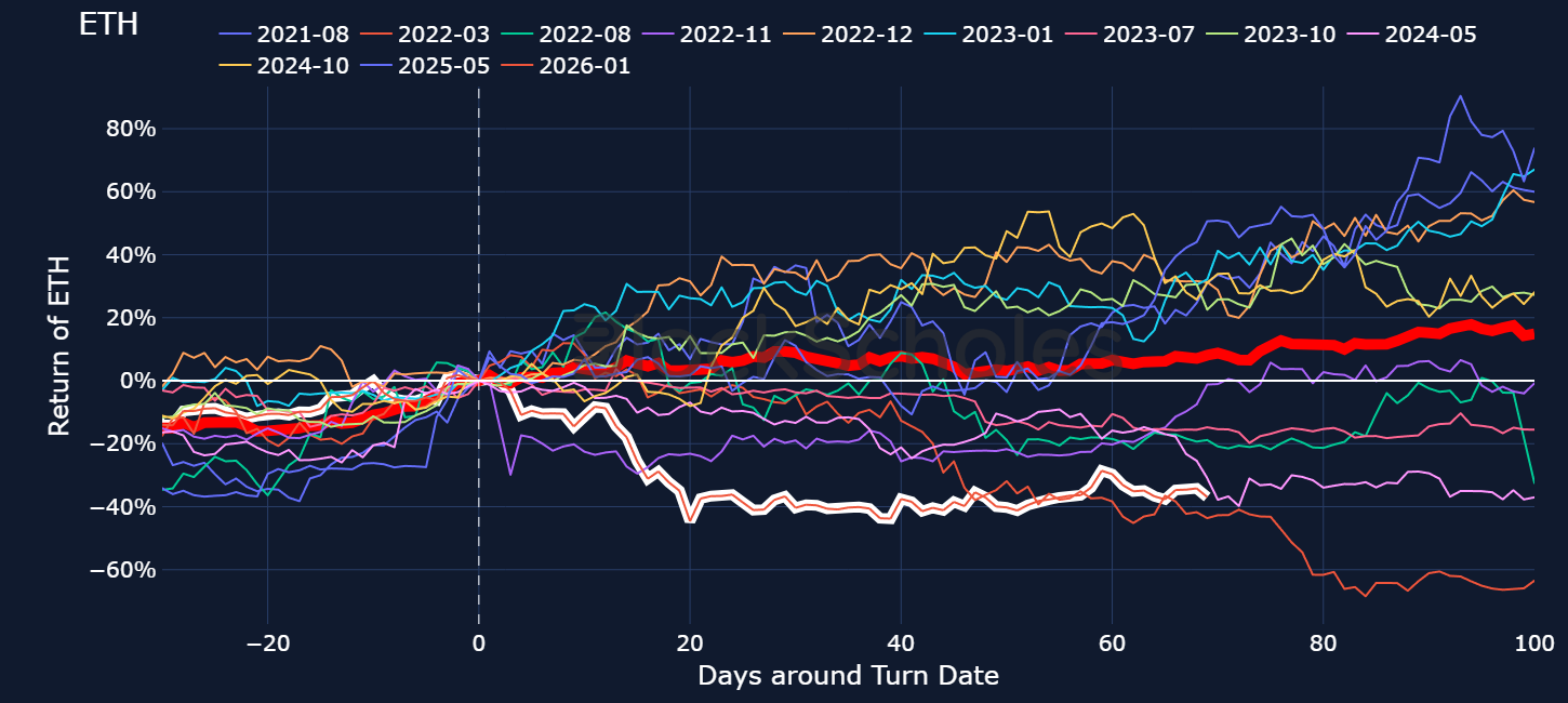 BLOCK SCHOLES ETH RISK APPETITE INDEX – Our Risk Appetite in ETH is also cautiously rebounding higher amidst ETH’s consolidation around the $2,000 mark. Similar to BTC, the crossing of the -0.5 threshold has not yet yielded the returns we would expect given the historical median path. ETH is down -37% since crossing that threshold 69 days ago; compared to a median return of +8%.