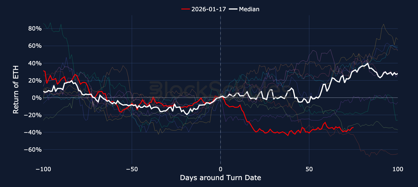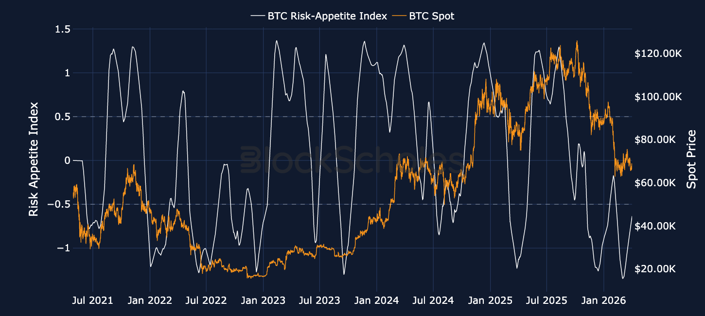 BLOCK SCHOLES BTC RISK APPETITE INDEX – The sideways spot price action has continued the recovery in the risk appetite index for BTC, as spot moves listlessly sideways and bearish momentum has halted. We now watch for the crossing of the -0.5 level, which has historically preceded several bullish moves higher.