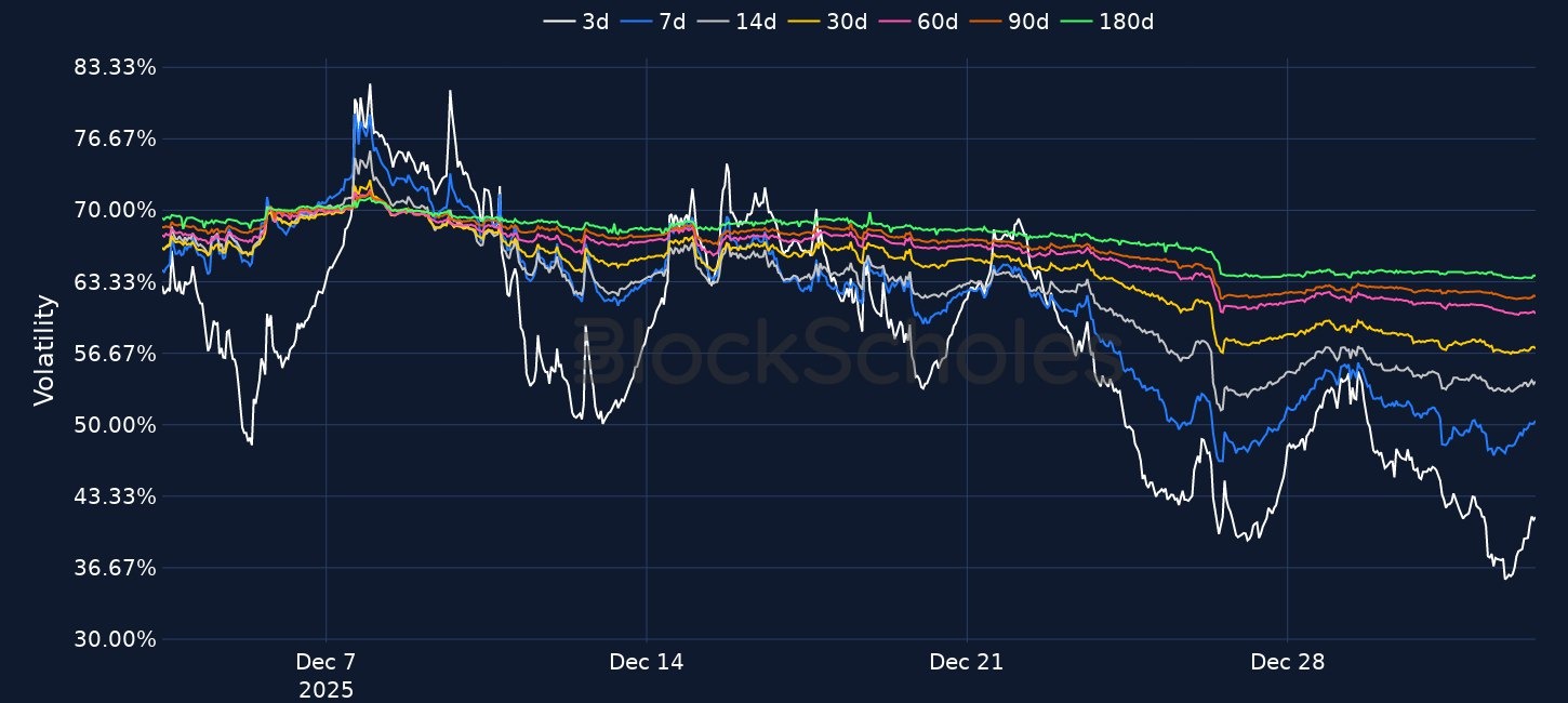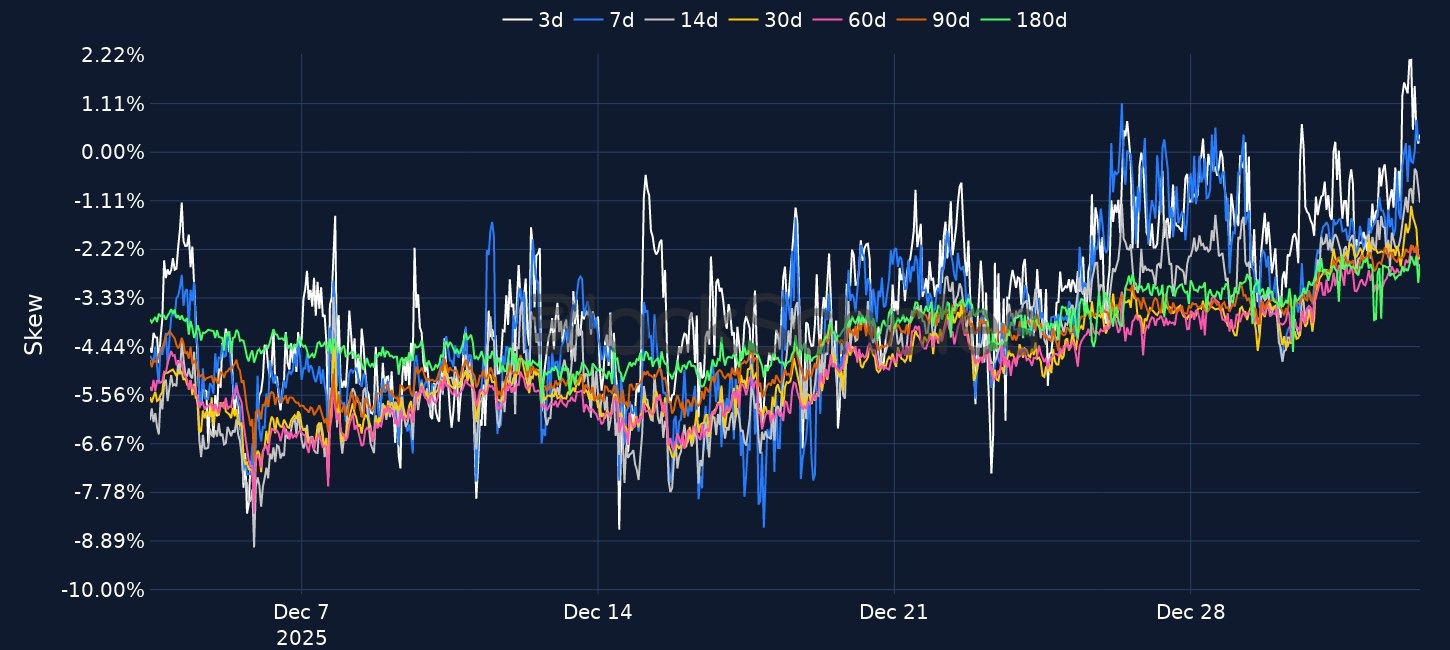 BTC remains rangebound between $85k and $95k and is trading around $89k, while ETH has broken back above the $3,000 psychological level and is holding near $3,035 after prior failed attempts. Derivatives positioning has turned more constructive, with short-dated volatility skews flipping from a put-premium through most of Q4 to a modest call-premium (BTC 7D 25-delta skew +0.74%, ETH +0.47%), alongside positive perpetual funding that indicates net-long bias. Cross-asset risk appetite is firmer to start 2026, with US equity futures higher and precious metals advancing on the day. Focus also turns to final December manufacturing PMIs across the US, UK, euro area and Canada, as December spot volumes across both CEX and DEX venues cooled materially.