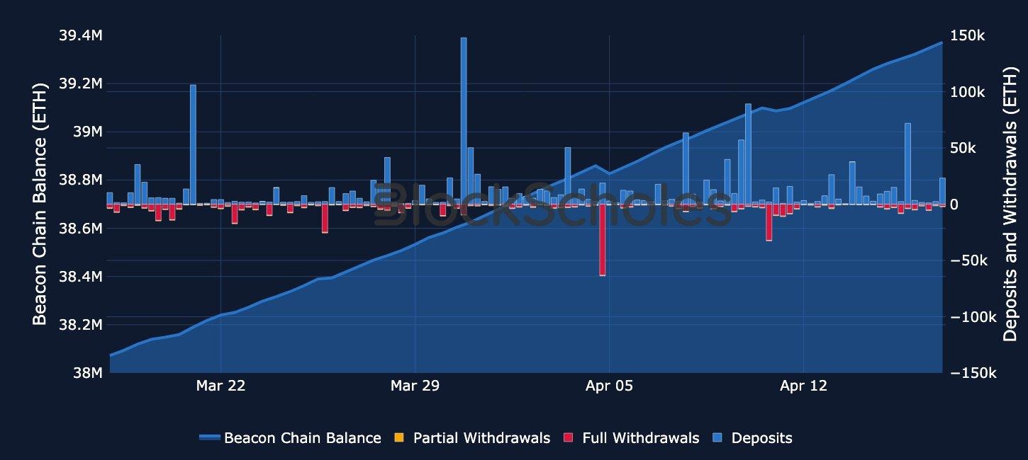 Beacon Chain - Over the past week, the Beacon Chain balance continued to edge higher and continued to rise over 39.2M ETH for the first time, reaching 39.4M ETH.
