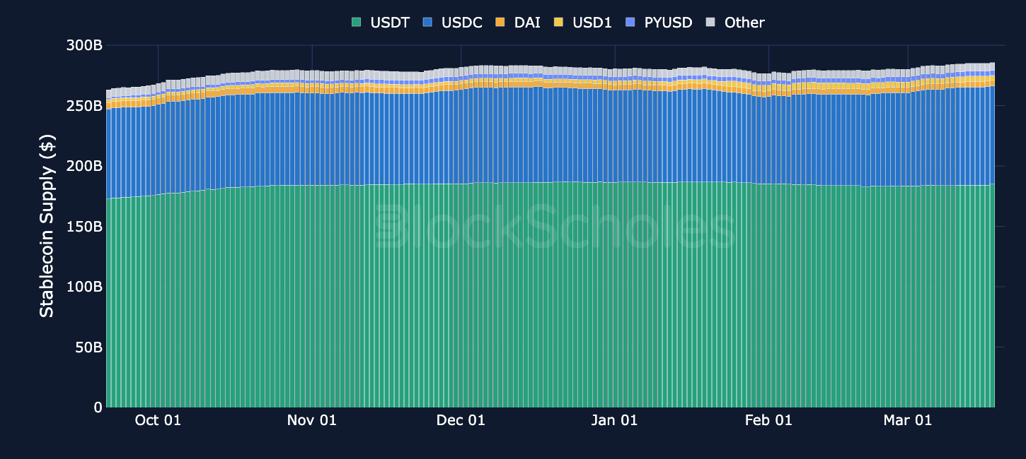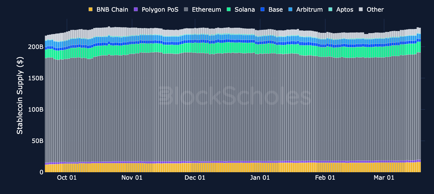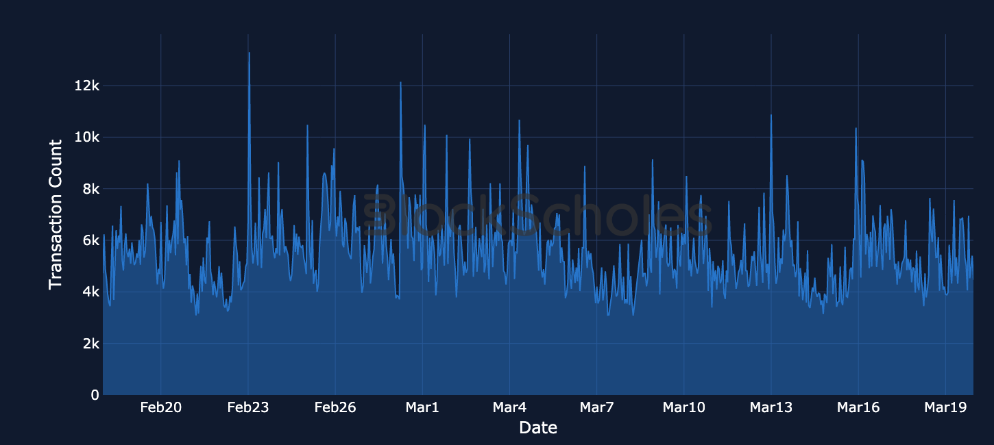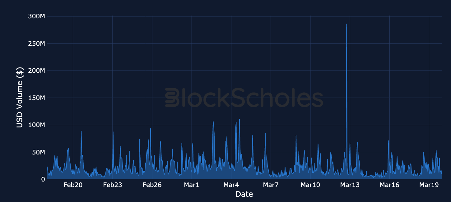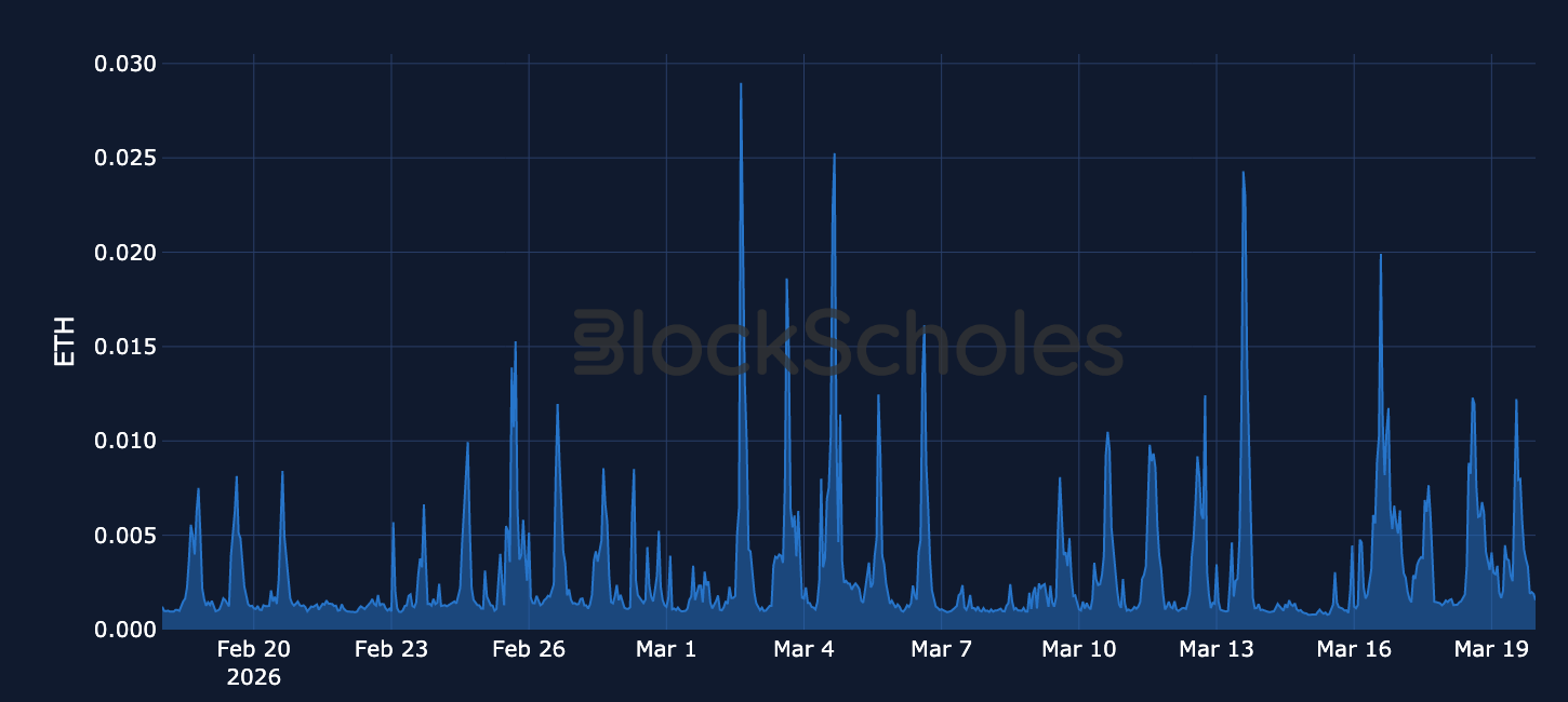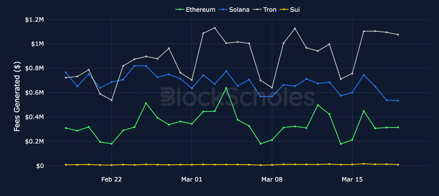 Daily Fee Generation – Over the past week, Tron fees have remained the highest, staying above $1.0M after a significant increase on March 16 from just $0.7M. Solana fees trended lower over the same period, falling rapidly from roughly $0.75M to about $0.53M. Ethereum fees briefly rose to around $0.45M before settling back near $0.30–0.32M.