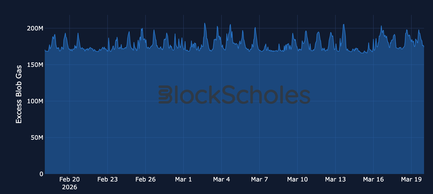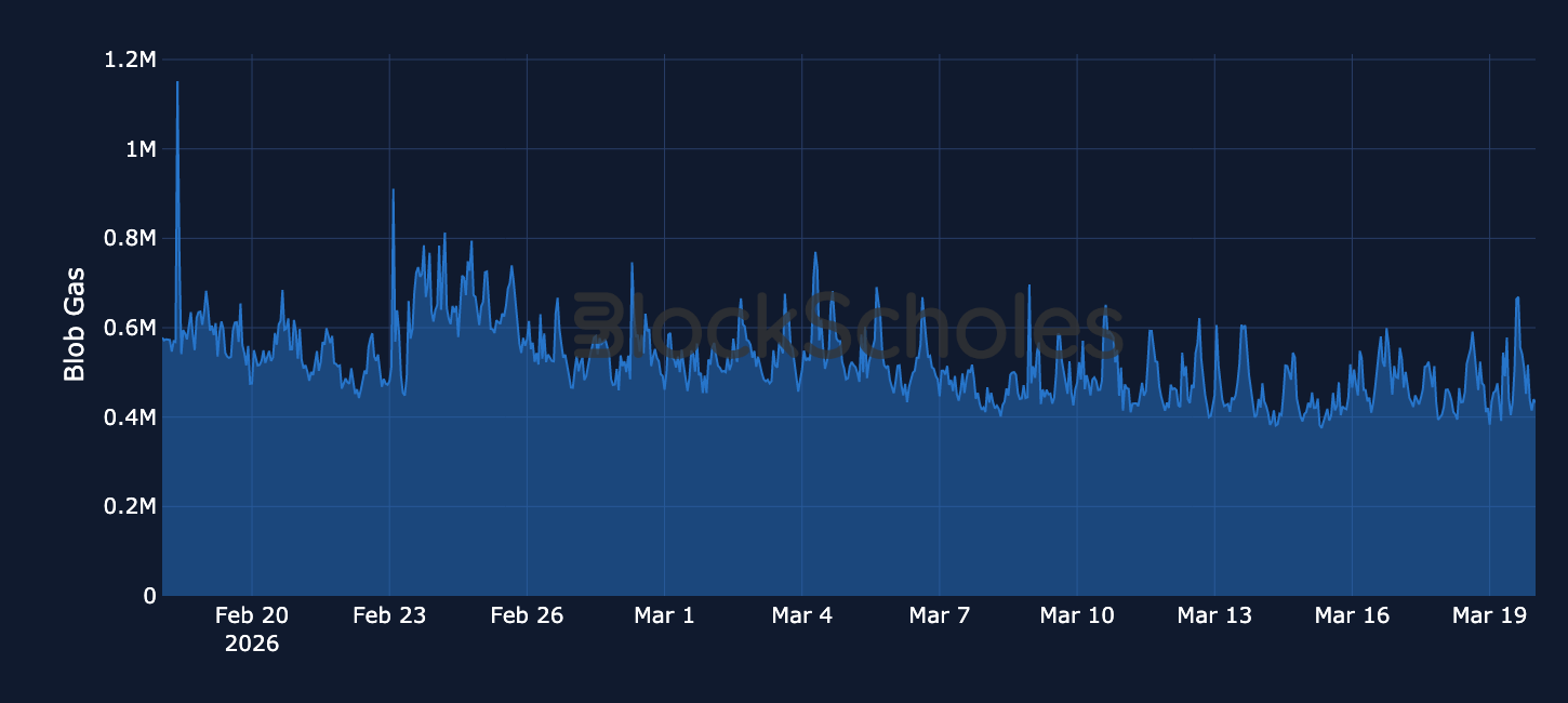 Blob Gas Usage – Over the past week, blob gas usage was broadly range-bound, fluctuating between roughly 0.40M and 0.60M. Although there were several brief spikes towards ~0.65–0.70M, these moves quickly faded, with usage repeatedly falling back into the 0.40–0.45M range. By the end of the week, blob gas usage was once again near 0.40M, placing it at the lower end of its recent range.