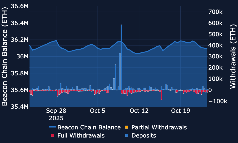 Beacon Chain - ETH staked on the Beacon Chain has remained steady at around 36M since July 2025.
