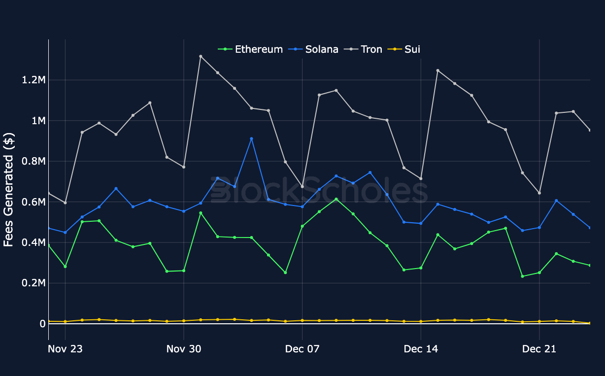 Daily Fees Generated across Ethereum, Solana, Tron & Sui