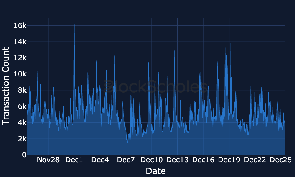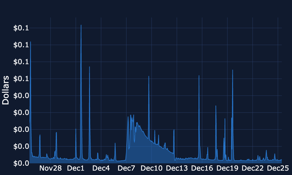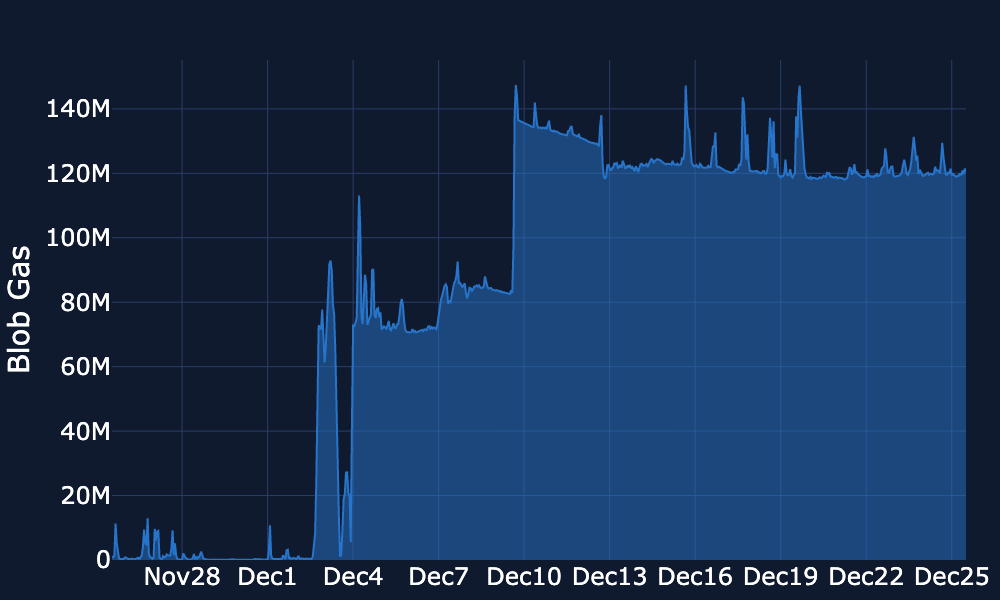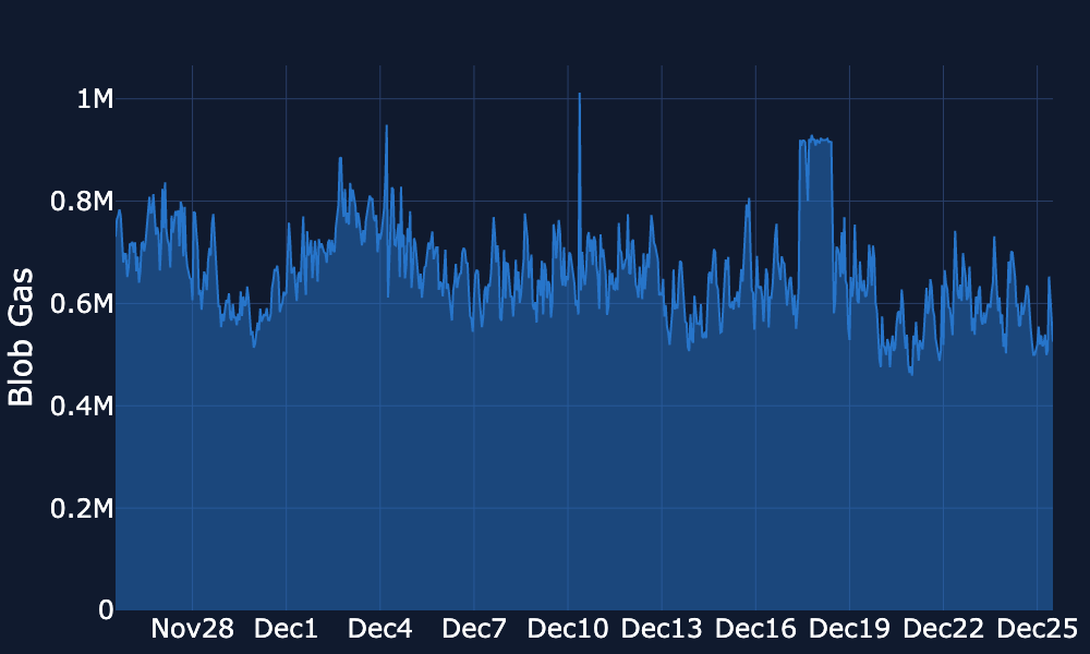 Blob Gas Usage – Since Dec 20, blob gas usage has drifted lower, moving from roughly ~0.6–0.65M towards ~0.5–0.6M, with brief spikes towards ~0.7M, and is currently arond 0.55M .