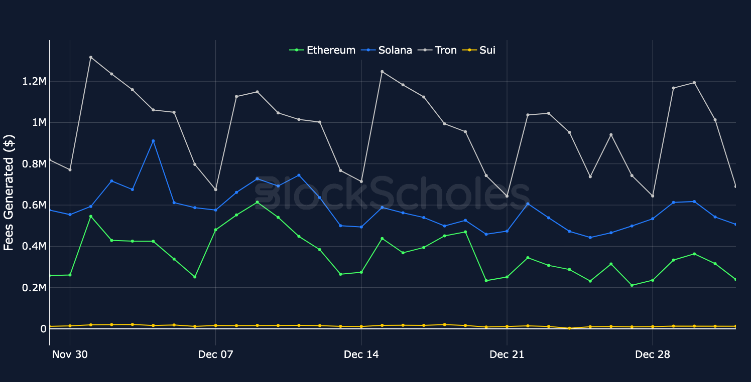 Daily Fees Generated across Ethereum, Solana, Tron & Sui