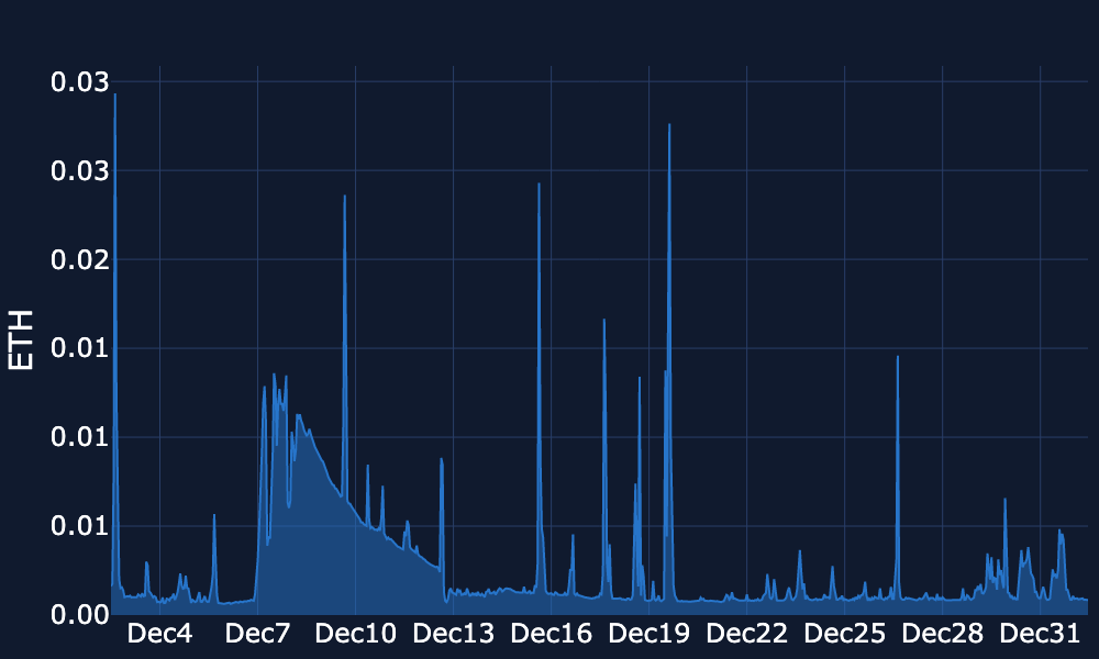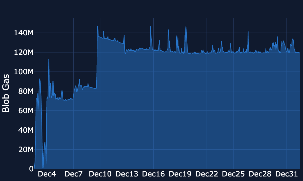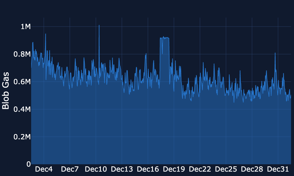 Blob Gas Usage – Usage briefly jumped towards ~0.9M around 18–19 Dec, then stepped down and has since held a lower ~0.5–0.6M range through the festive period, with only short-lived spikes above ~0.65M. Usage is currently around ~0.5–0.55M.