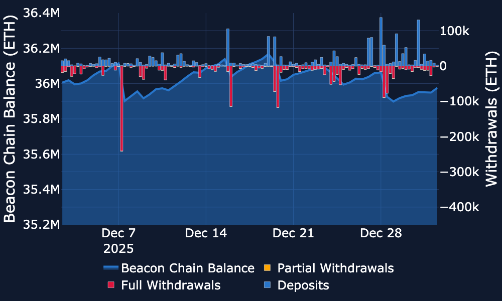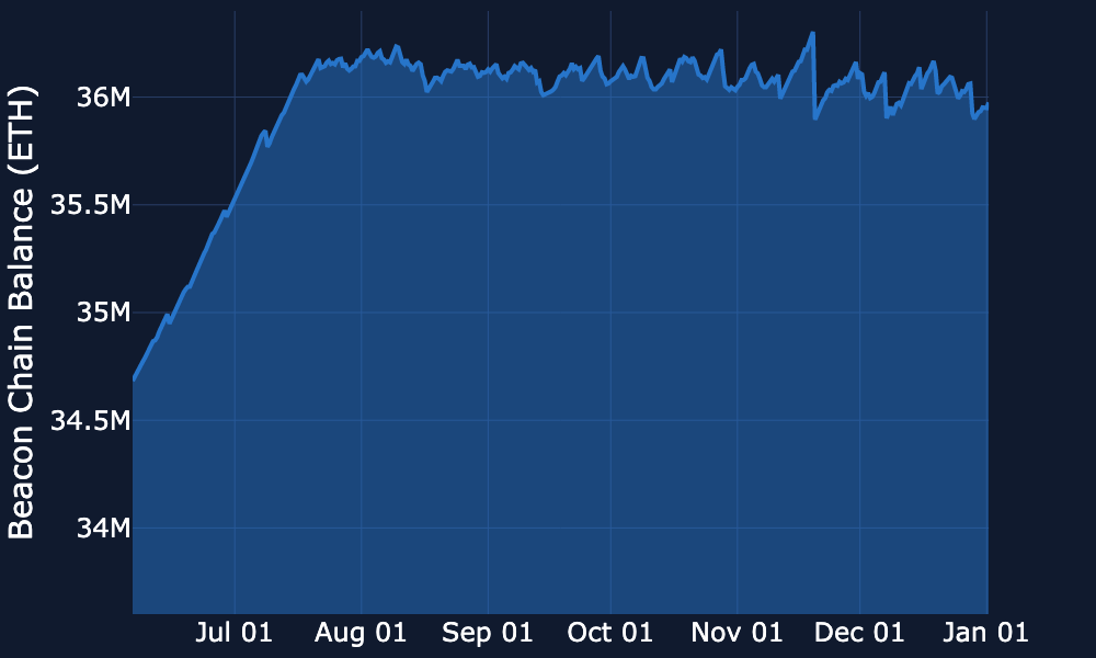 Beacon Chain - Over the past week, the balance has drifted slightly lower from around ~36.1M ETH towards ~36.0M ETH.
