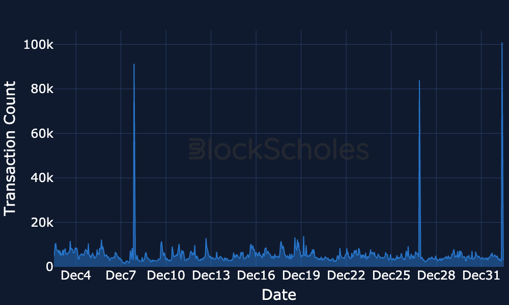 Daily Fee Generation – Around 24 Dec, fees eased across chains, with Tron’s fees falling from just above ~$1.0M towards the ~$0.7M area, while Solana’s fees drifted into the mid-~$0.4Ms and Ethereum’s fees back to the low-~$0.2Ms. Activity rebounded into the final week with Tron’s fees near ~$1.2M and Solana’s fees ~$0.6M, before easing again into month-end.