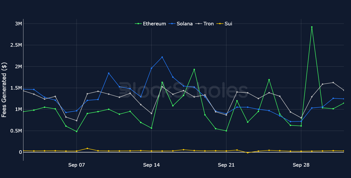 Daily Fees Generated across Ethereum, Solana, Tron & Sui