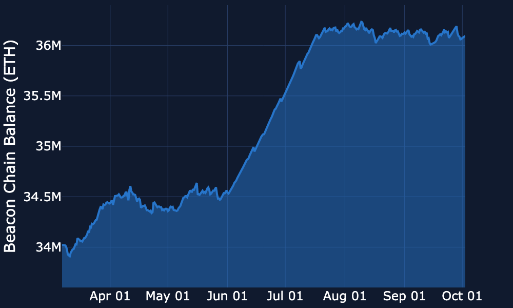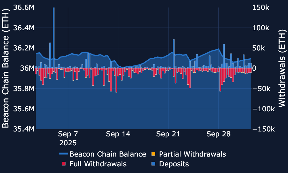 Beacon Chain - ETH staked on the Beacon Chain continues to remained steady between 36M to 36.2M since July 2025.