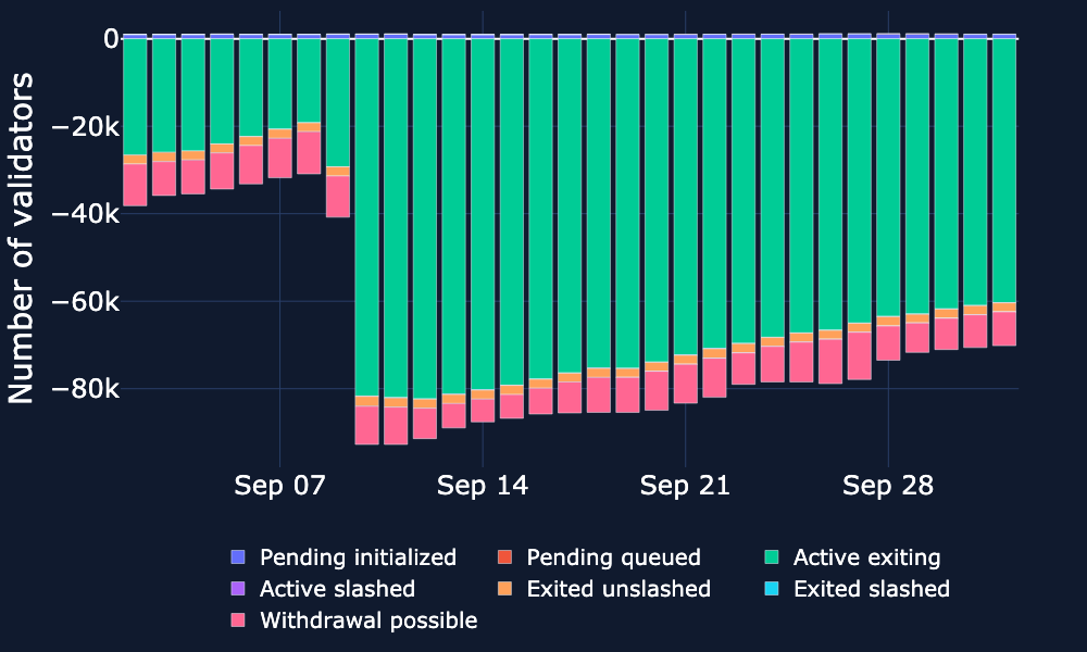 Beacon Chain Validator States - Active exiting validators continue to dominate validator state activity following their spike on 10 September. However, they have since started to decrease, alongside a slight decline in withdrawals possible.