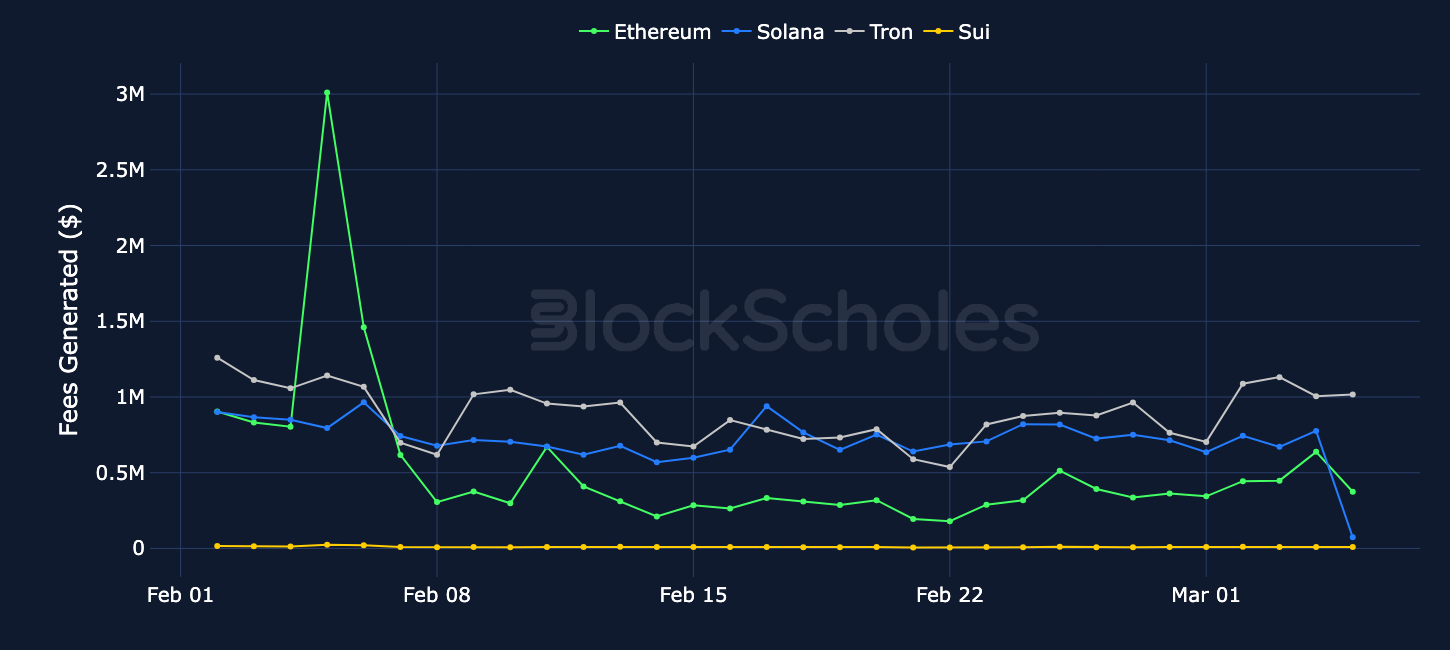 Daily Fees Generated across Ethereum, Solana, Tron & Sui