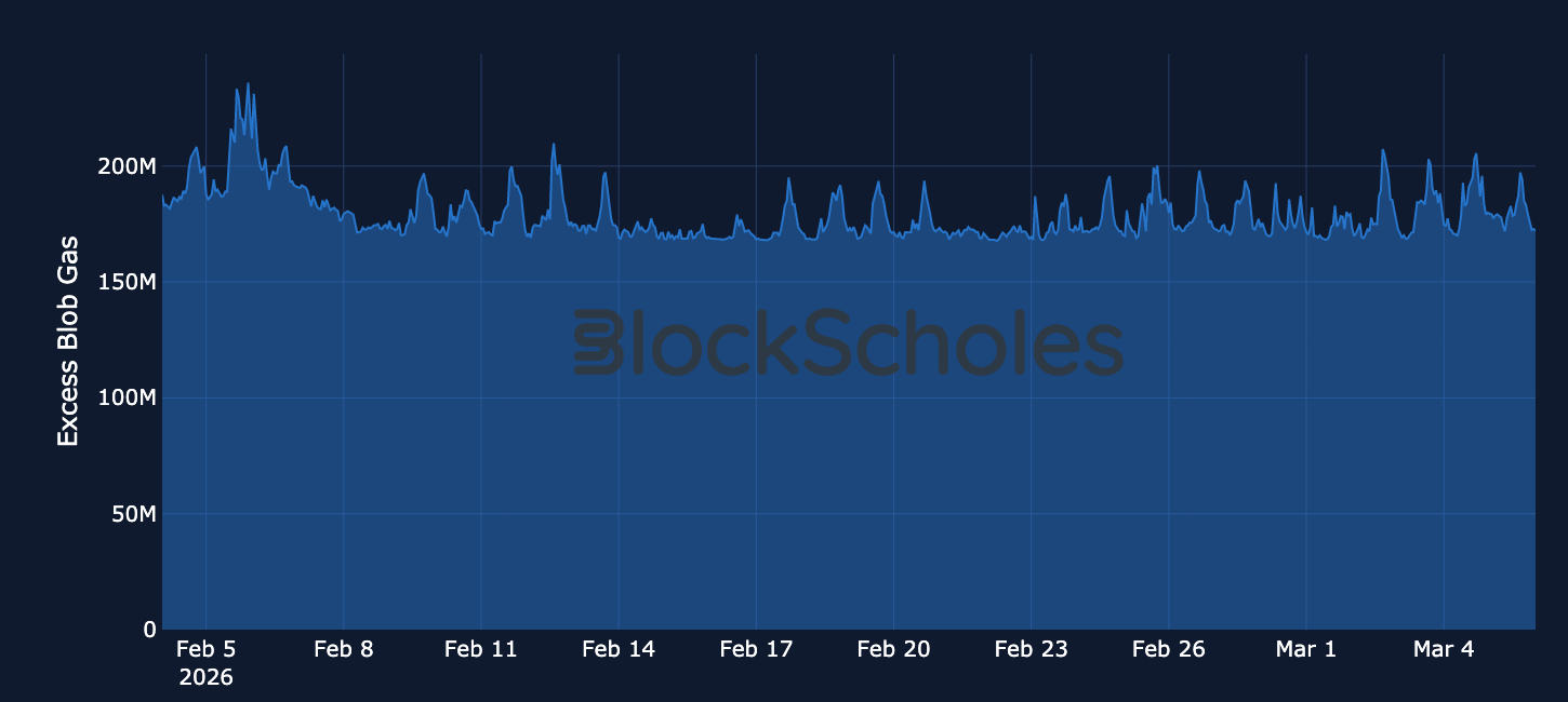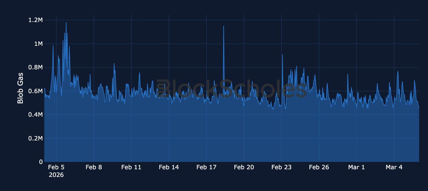 Blob Gas Usage – Over the past week, blob gas usage has been volatile, but was not steadily declining. Usage mostly held in a ~0.45M–0.60M range, with several brief spikes, including moves to roughly ~0.65M–0.75M and one larger jump close to ~0.8M. Recently, however, the usage fell back toward the low end of the recent range, at around ~0.45M.