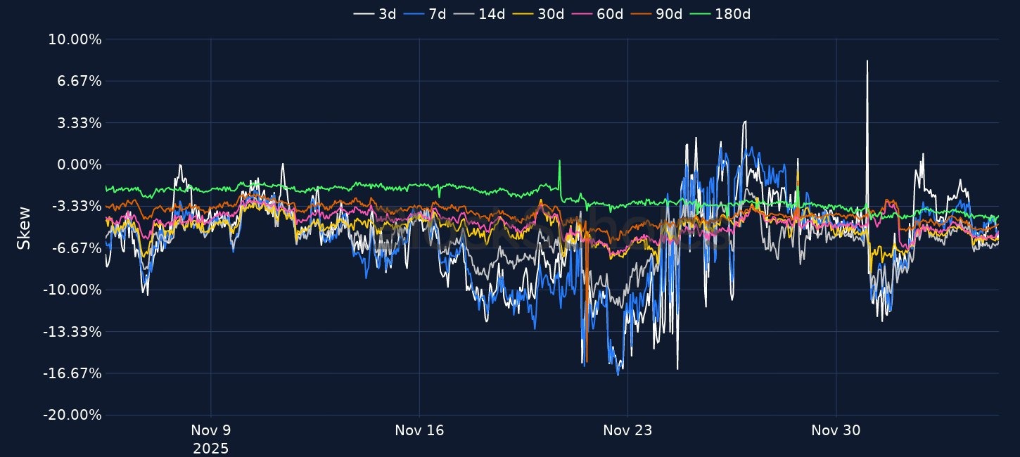 - The volatility premium assigned to short-tenor, out-the-money puts has compressed from 11% on Dec 1, 2025 to 5% above calls — still bearish, but not as extreme as during the worst of the sell-off.
