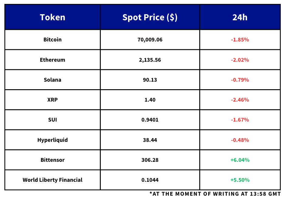 - BTC surged vertically higher to $71K and has since remained above the psychological $70K region. Over the past 24 hours, BTC is up 3.9%, while ETH is up 5.3%. SOL in particular has outperformed – up 6.5%.